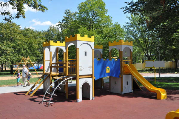 Beschreibung: 16 Steher (Pfosten), 4 Podeste, 5 Handläufe, 10 Brüstungen mit Intaglio- Fräsungen, 1 Absturzsicherung für Rutsche, 1 Leiter, 1 Bergsteiger-Kletterwand schräg, 1 Mondleiter in Edelstahl, 1 Netzeinstieg mit Rahmen, 2 Fixbrücken, innen mit senkrechter Brüstungsverkleidung, außen mit Brückenbogen, 1 Wackelbrücke, 1 Netz-Bogenbrücke, Turmabschluss oben mit Zinnen. Aufständerung mit 16 Stk. Winkeleisen, 6 Stk. Eisenschuhe für Aufstiege