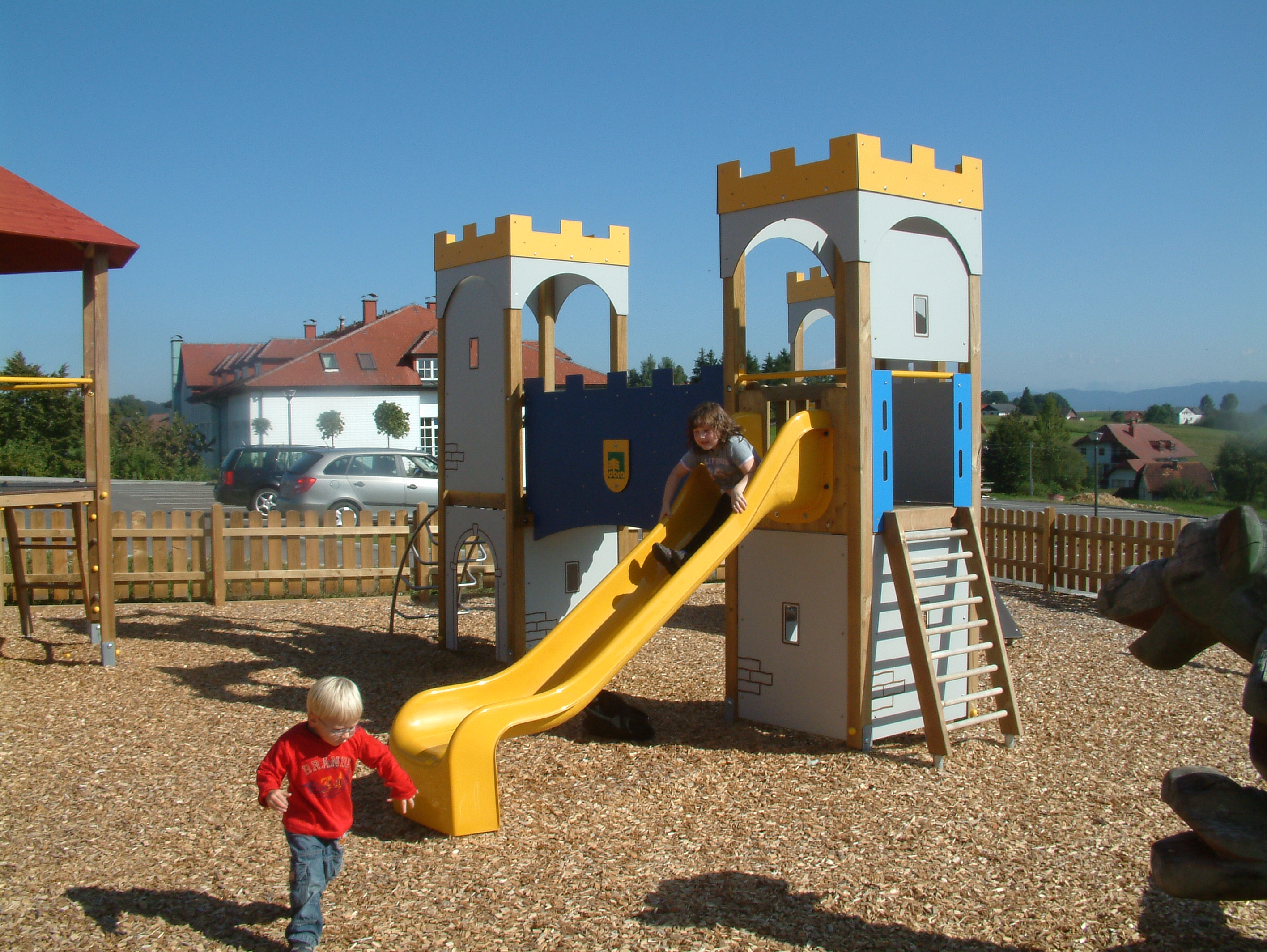 Beschreibung: 8 Steher (Pfosten), 2 Podeste, 3 Handläufe, 10 Brüstungen mit Intaglio-Fräsungen, 1 Absturzsicherung für Rutsche, 1 Fixbrücke, einseitig mit Brückenbogen, einseitig mit senkr. Brüstungsverkleidung, 1 Aufstiegsleiter, 1 Mondleiter. Aufständerung mit 8 Stk. Winkeleisen, 2 Stk. Eisenschuhe für Aufstiege. Fundamente: 12 Stk. 40x40x40 cm, 1 Stk. 60x40x50 cm