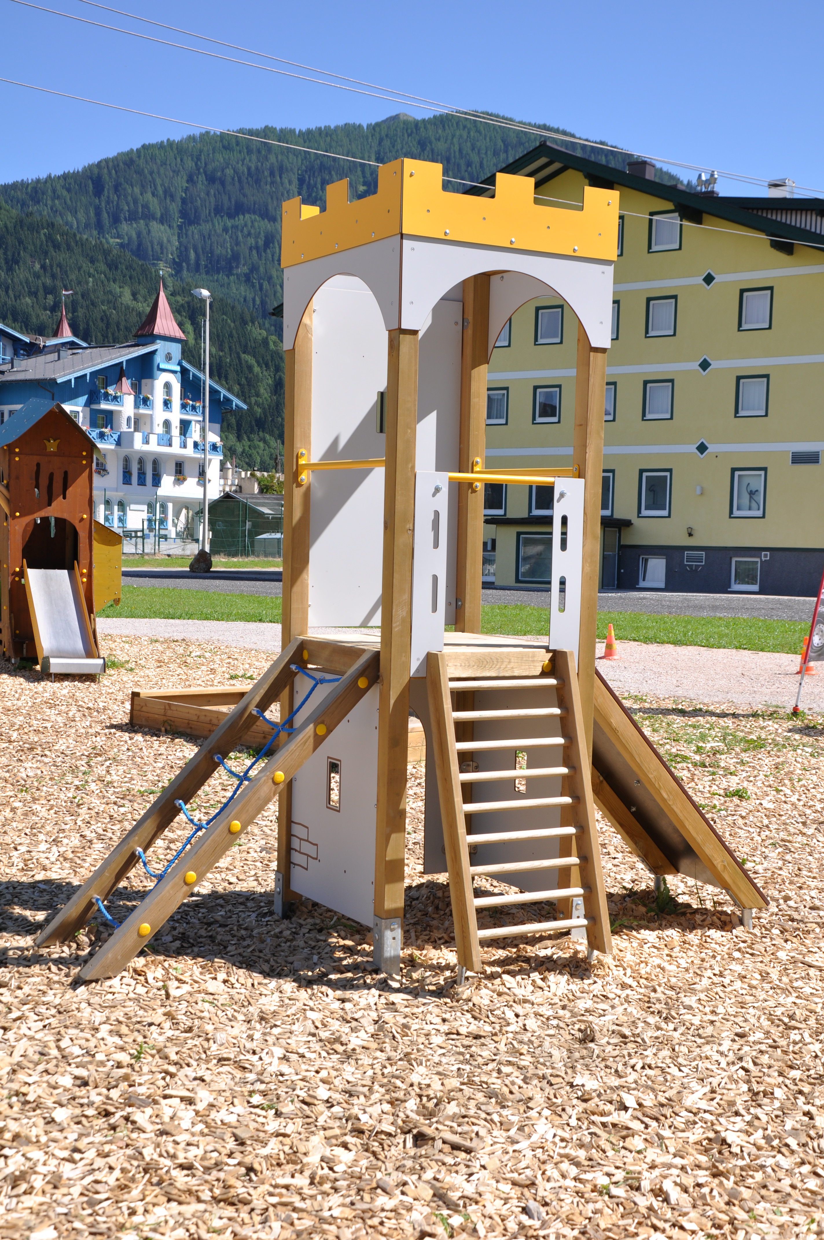 Beschreibung: 4 Steher (Pfosten), 1 Podest, 3 Handläufe, 4 Brüstungen mit Intaglio- Fräsungen, 1 Aufstiegsleiter schräg, 1 Bergsteiger-Kletterwand schräg, 1 Netzeinstieg mit Rahmen, Turmabschluss oben mit Zinnen. Aufständerung mit 4 Stk. Winkeleisen, 6 Stk. Eisenschuhe für Aufstiege. Fundamente: 10 Stk. 40x40x40 cm