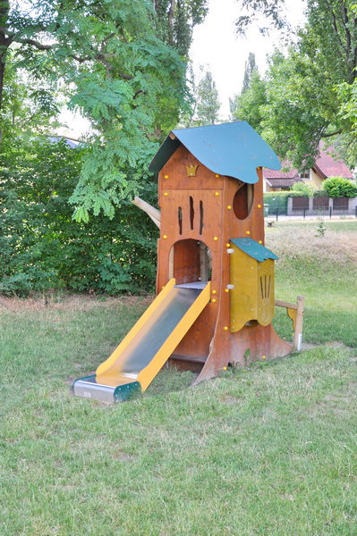 Beschreibung: 5 Steher (Pfosten) Ø 10 cm, 2 Podeste, über Podestunterzüge an den Stehern befestigt, 4 Brüstungen aus Schichtholzplatte 20 mm, kastaniefarben lasiert, mit diversen Intaglio-Fräsungen versehen, 1 Kriechröhren-Anbau aus Schichtholzplatte 20 mm, gelb lasiert, und HPL-Platte 8 mm, grün, 1 senkrechter Leiternauf- stieg in einer Brüstungsplatte eingefräst, Trittflächen verstärkt, 1 Rampe mit aufgeschraubten Kletterhilfen, einseitig mit Handlauf aus Kantholz 3/9 cm, 1 Sitzbank aus Siebdruckplatte 20 mm, mit verzinkten Stahlwinkeln verschraubt, 1 Giebeldach mit Firstpfettenkantholz 7/7 cm und Sparren aus Kantholz 9/9 cm, Dachflächen aus HPL- Platte 8 mm, grün, 1 Rutsche, 2 aufgeschraubte Kronen aus Schichtholzplatte 20 mm, gelb lasiert, 2 aufgeschraubte Ast-Stümpfe aus Rundholz Ø 10 cm.