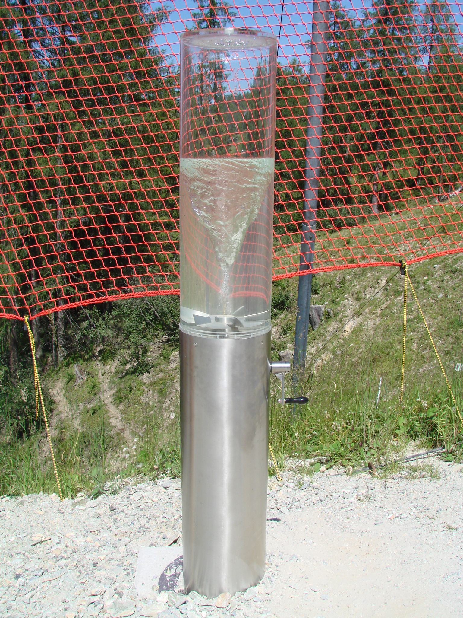 Ein Rührwerk im Inneren des Zylinders setzt durch Hand kurbelantrieb das Wasser, das die Hälfte des Behälters ausfüllt, in erst langsame, dann schnellere Umdre hung. Das Wasser steigt dabei an den Wänden hoch und formiert sich zu einem Strudel mit einem bis zum Boden reichenden Sogtrichter in seinem Inneren.