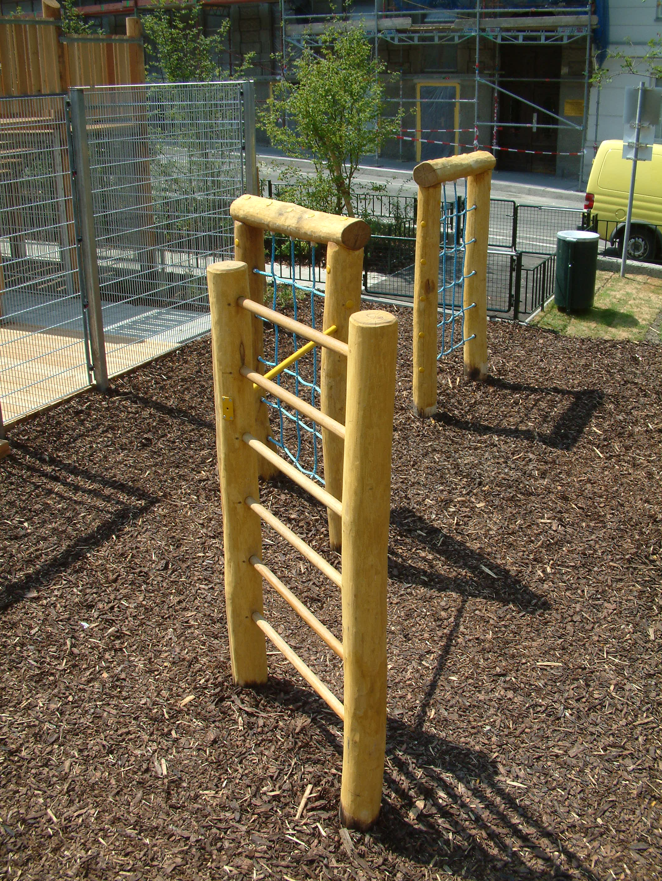 Beschreibung: 2 Kletterrahmen aus Rundhölzern Mindest Ø 14 cm, Eichensprossen Ø 4,5 cm, eingebohrt und verschraubt, 1 Kletternetz senkrecht, 1 Reckstange aus Stahlrohr, verzinkt und gelb pulverbeschichtet, Schrauben Edelstahl.