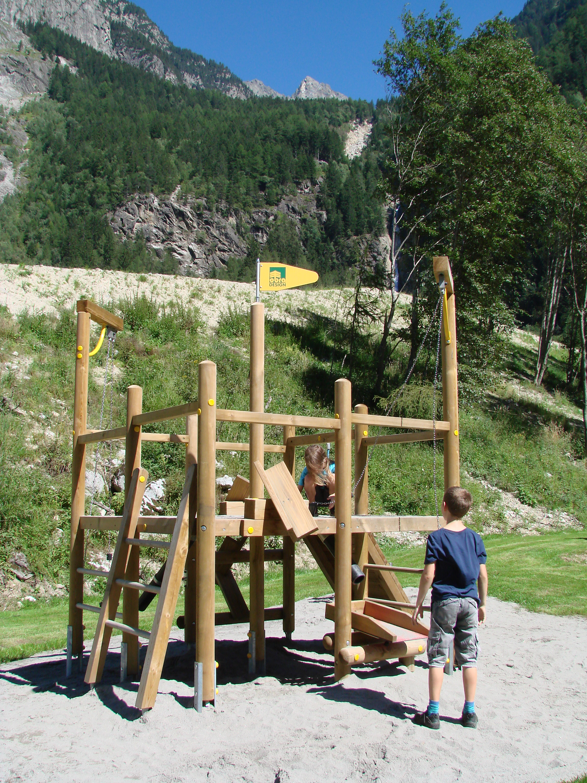 Beschreibung: 10 Steher (Pfosten), Rundhölzer Ø 12 cm, 1 Leiter, 4 MAXIMO-Turmpodeste, 8 Handläufe, 1 schiefe Ebene mit Hangeltau, 2 Kranarme, fix montiert, 2 Sandaufzüge mit Seilrollen, 2 Sandbehälter aus Gummi zum Sandtransport, 2 Sandrohre, 1 Sandschütte fix, 1 Sandschütte beweglich, 2 Sandrinnen, V-förmig mit Sandrad, Edelstahl.