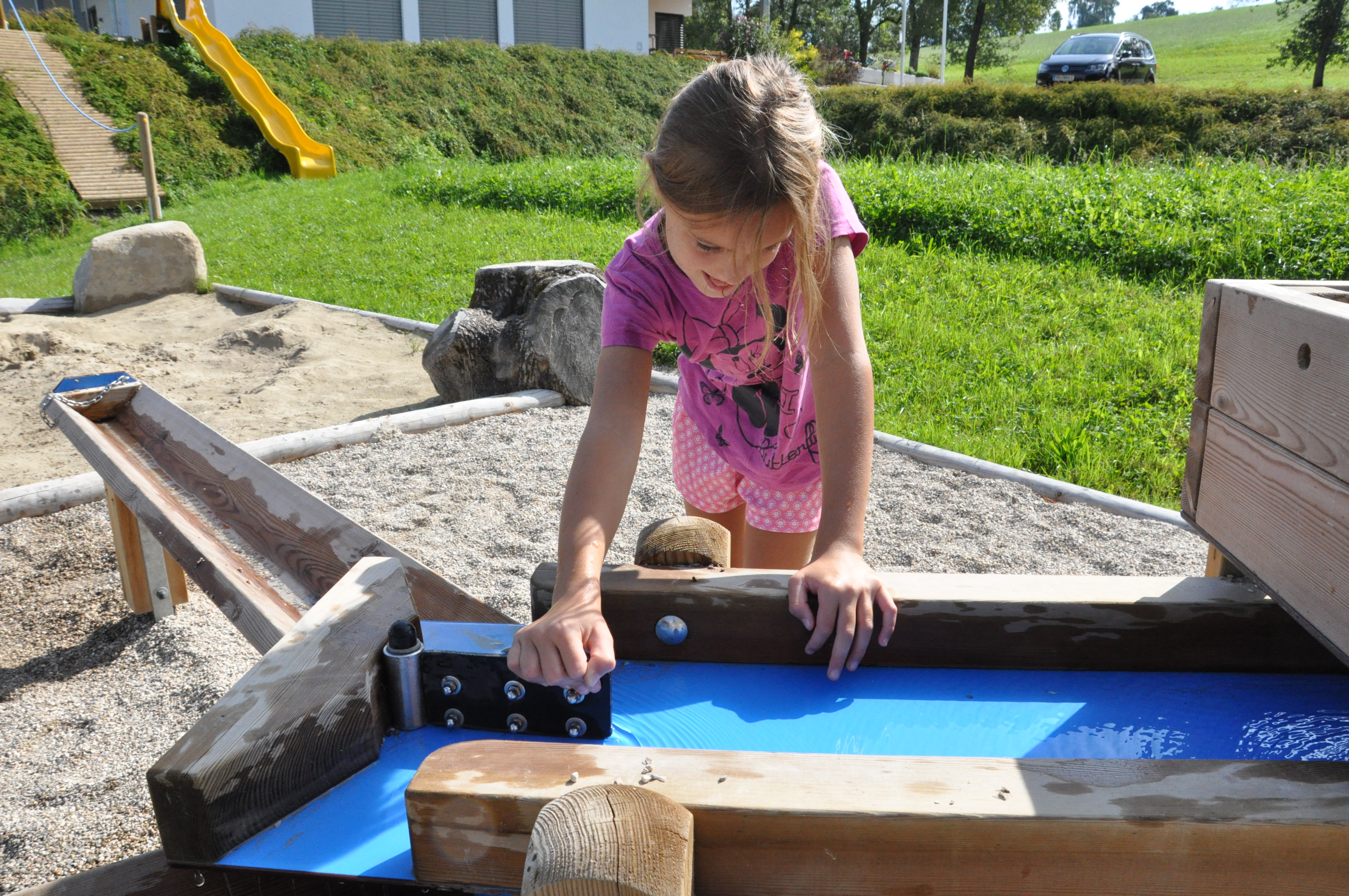 Wasser fühlen und beobachten sind die primären Erfahrungen bei Wasserspielplätzen. Doch auch selbst gestalten, das Wasser aufzustauen und umzuleiten sind wertfolle Lernprozesse die angestoßen werden.