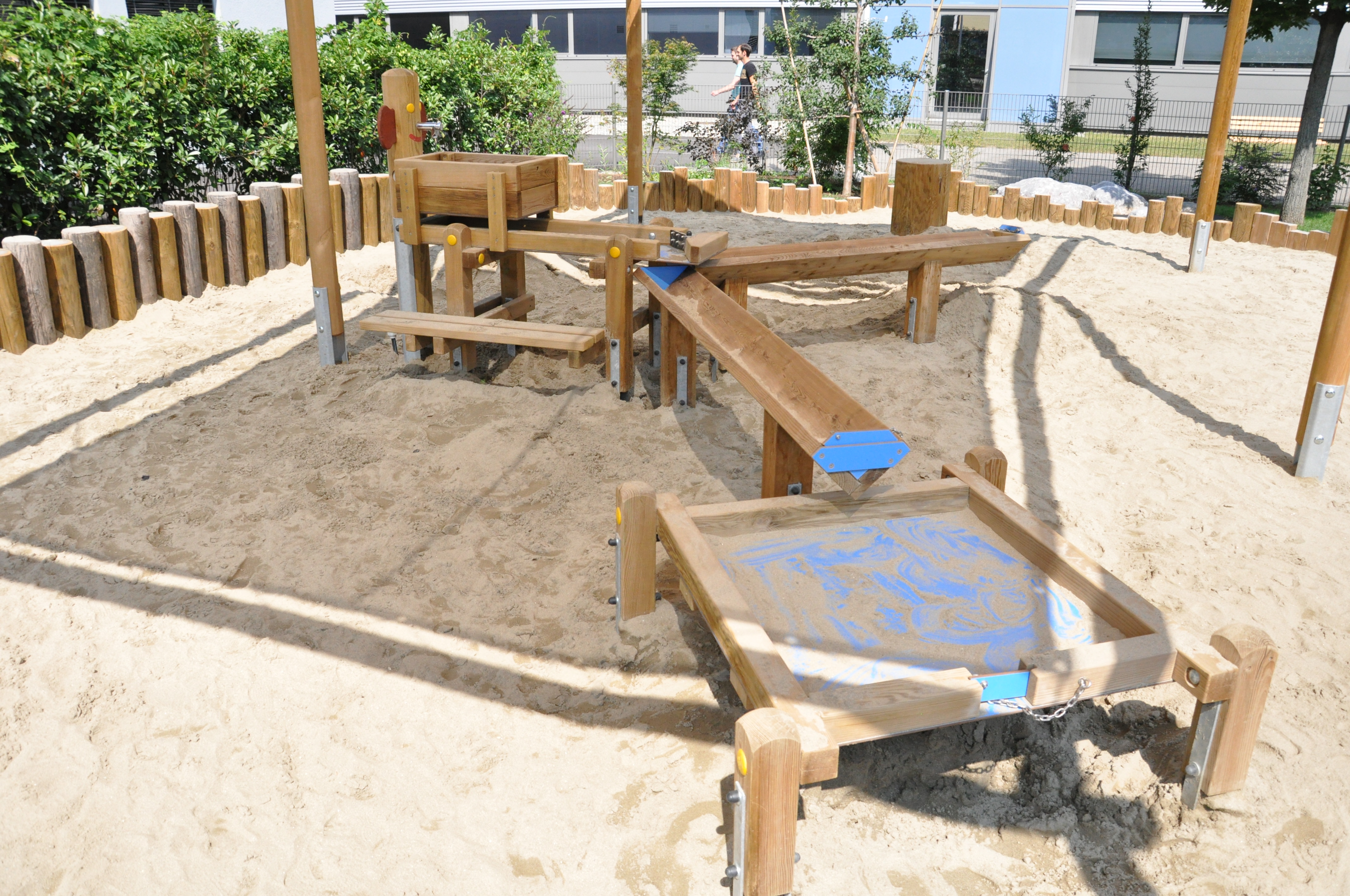 Das Miniwasserspiel ermöglicht lustvolle Erfahrungen mit dem Element Wasser zu sammeln. In einem Sandbereich installiert wird der Sand zusätzlich zum Matschen und Bauen verwendet.