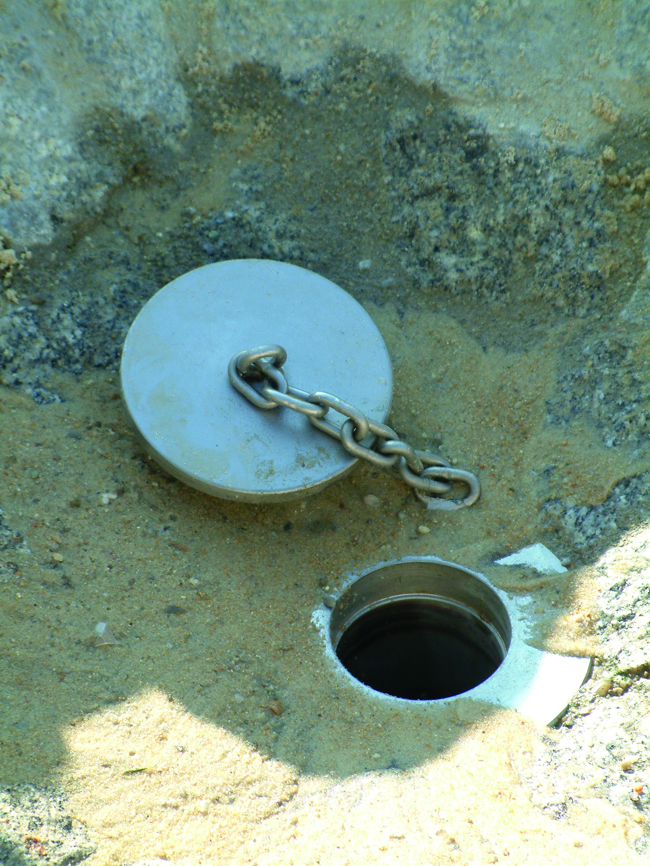 Der Bodenablauf ist für künstliche Bachläufe gedacht, bei denen eine unterirdische Ableitung notwendig ist. Der Bodenablauf ist mit einem Deckel verschließbar. Damit keine größeren Steine in das Ablaufrohr gelangen, ist der Bodenablauf mit einem Gitter versehen.