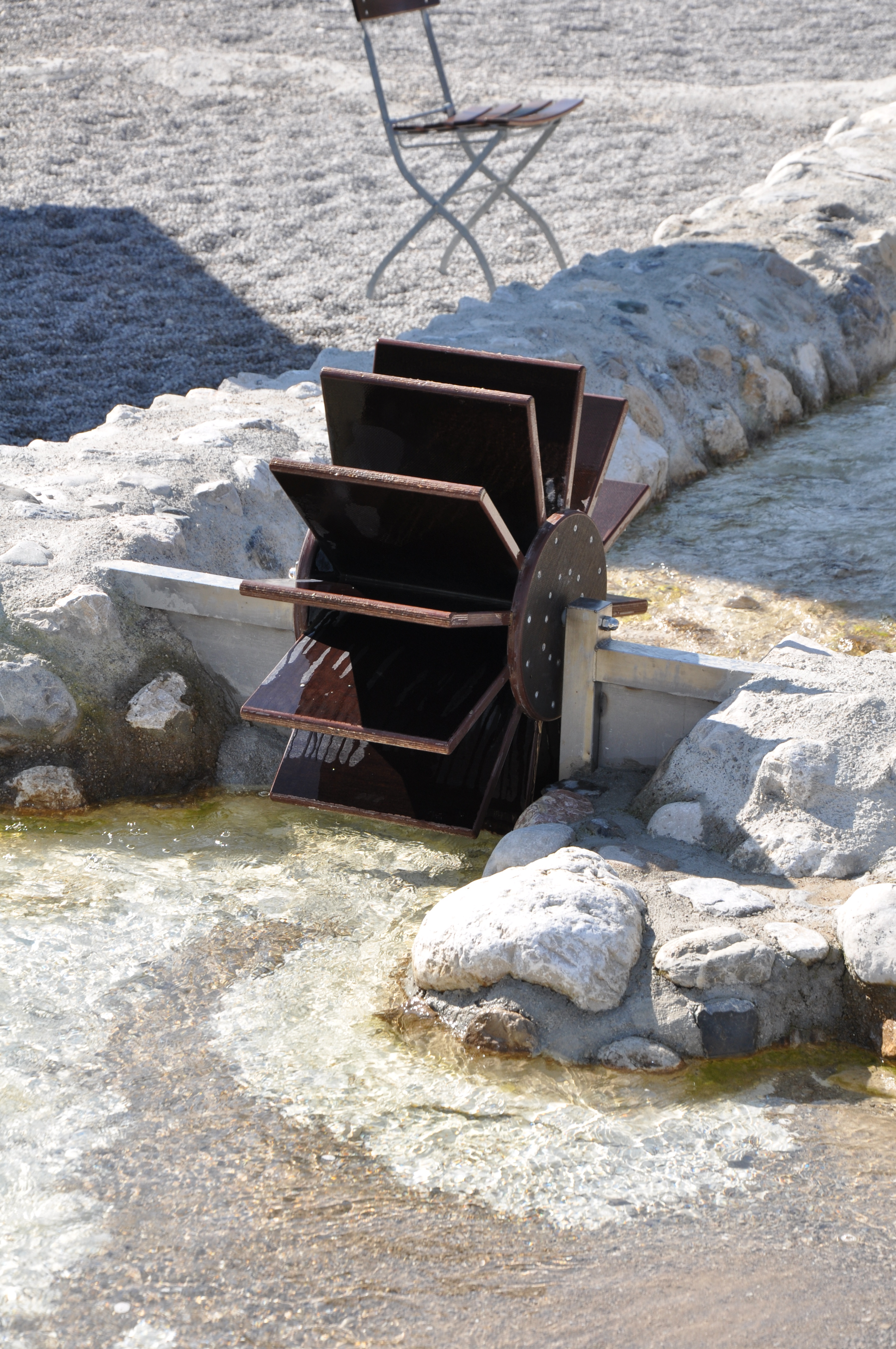 Die Wehr mit Wasserrad kann in größeren Bachläufen eingesetzt werden um mit der Wasserkraft das Wasserrad anzutreiben. Es wird empfohlen eine Wassersperre vorgelagert in den Bachlauf zu installieren, um eine entsprechende Wassermenge zum Antrieb des Rades aufstauen zu können..