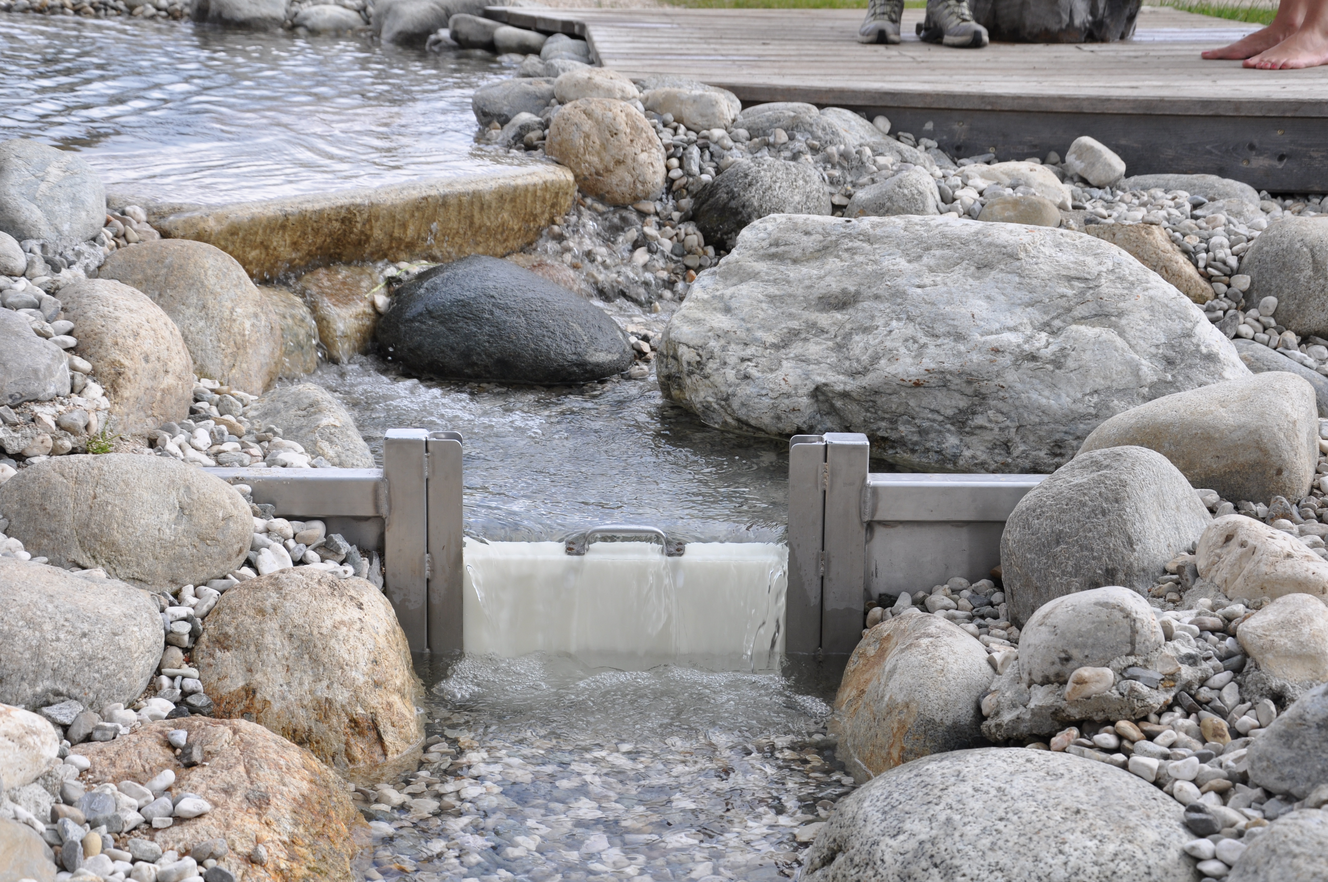Das Staubrett kann in größeren Bachläufen zur Aufstauung verwendet werden. Das eingesetzte Staubrett kann über einen Handgriff herausgezogen werden. Das Staubrett ist mittels Kette gegen wegschwemmen gesichert.