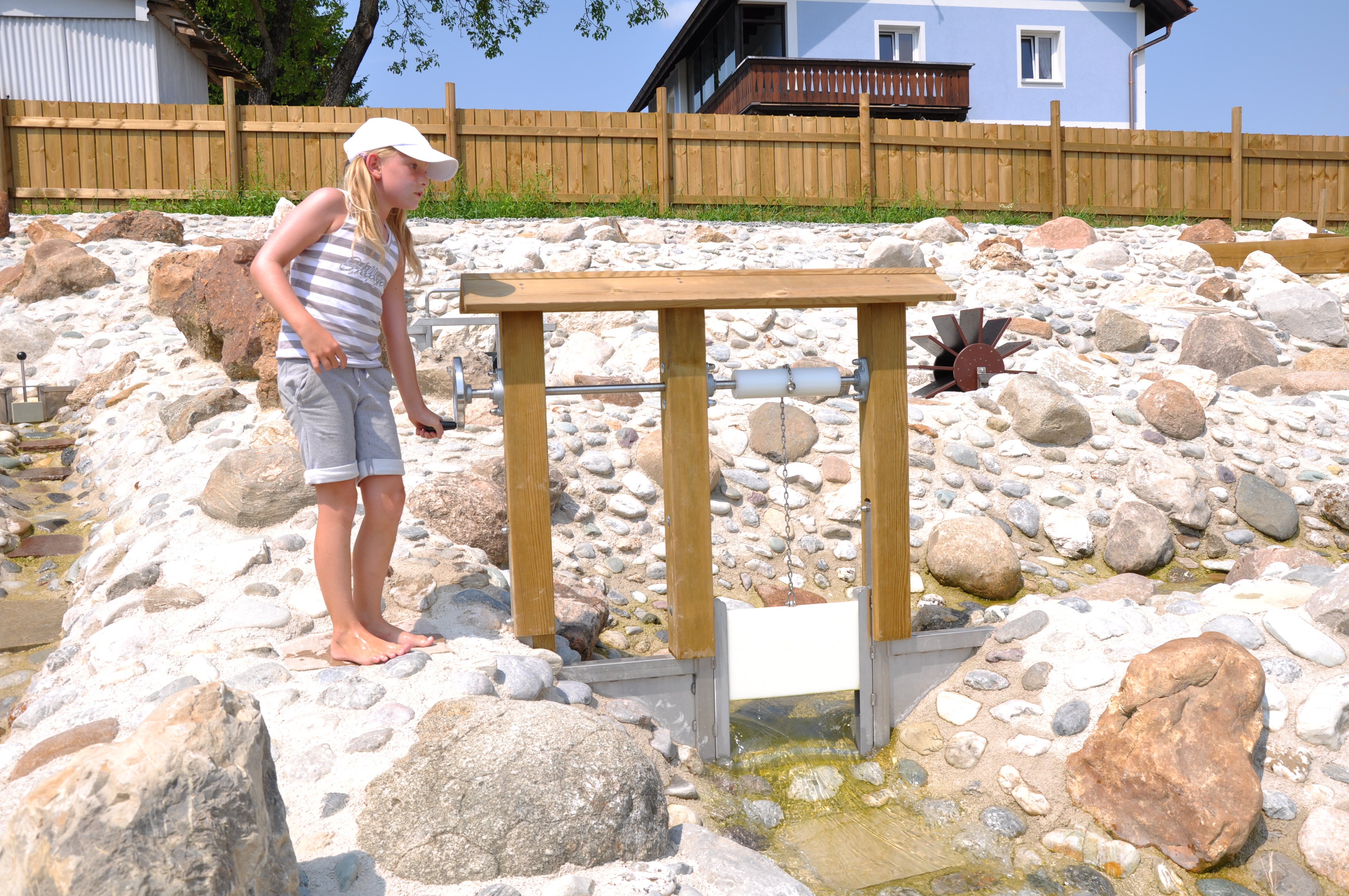Die Kurbelwehr kann in größeren Bachläufen zur Aufstauung verwendet werden. Das eingesetzte Staubrett mit Kettenzug kann über ein Kurbelrad betätigt werden. Die Achse der Kurbelwehr befindet sich auf ca. 60 cm Höhe in einer Holz-Konstruktion mit kleinem Dach.