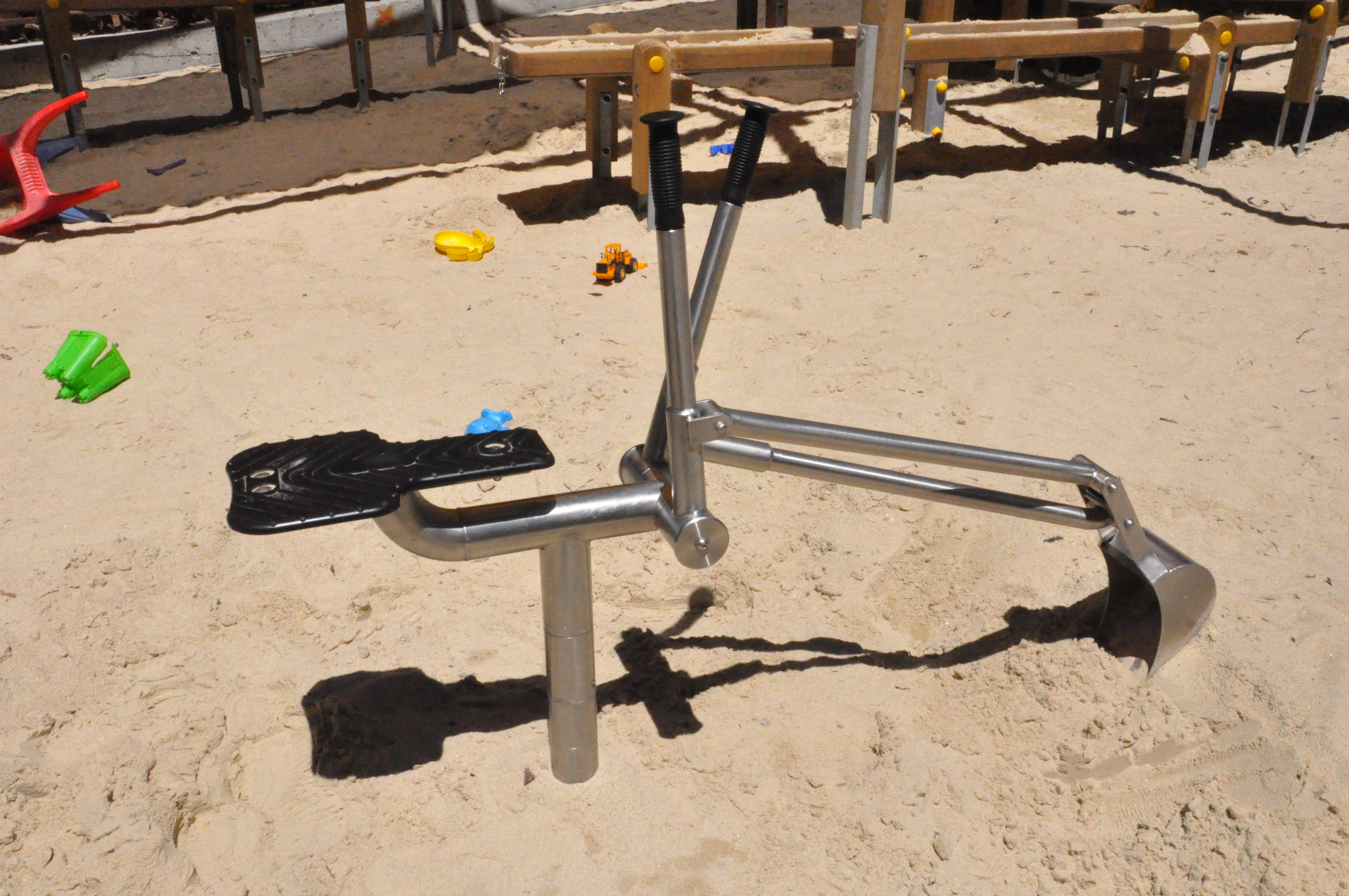 Der Sitzbagger ist ein bewegliches Sandspielgerät, aus massiven Edelstahlrohren, mit 2 langen Hebelarmen, mit Gleitlagern, zur Bedienung der Schaufel. Das Oberteil ist 360° drehbar.