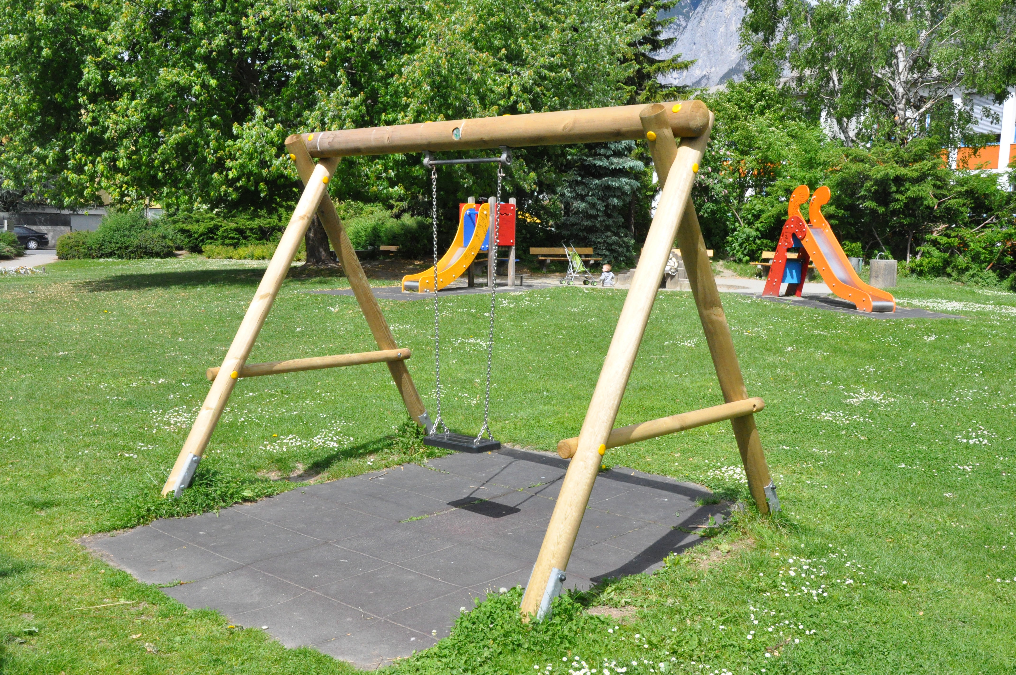 Die Einfachschaukel besteht aus zwei massiven A-Stützen und einem 3,0 m langen Schaukelbalken. Der Schaukelbereich ist seitlich durch Durchlaufsicherungen zwischen den A-Stützen abgeschirmt.