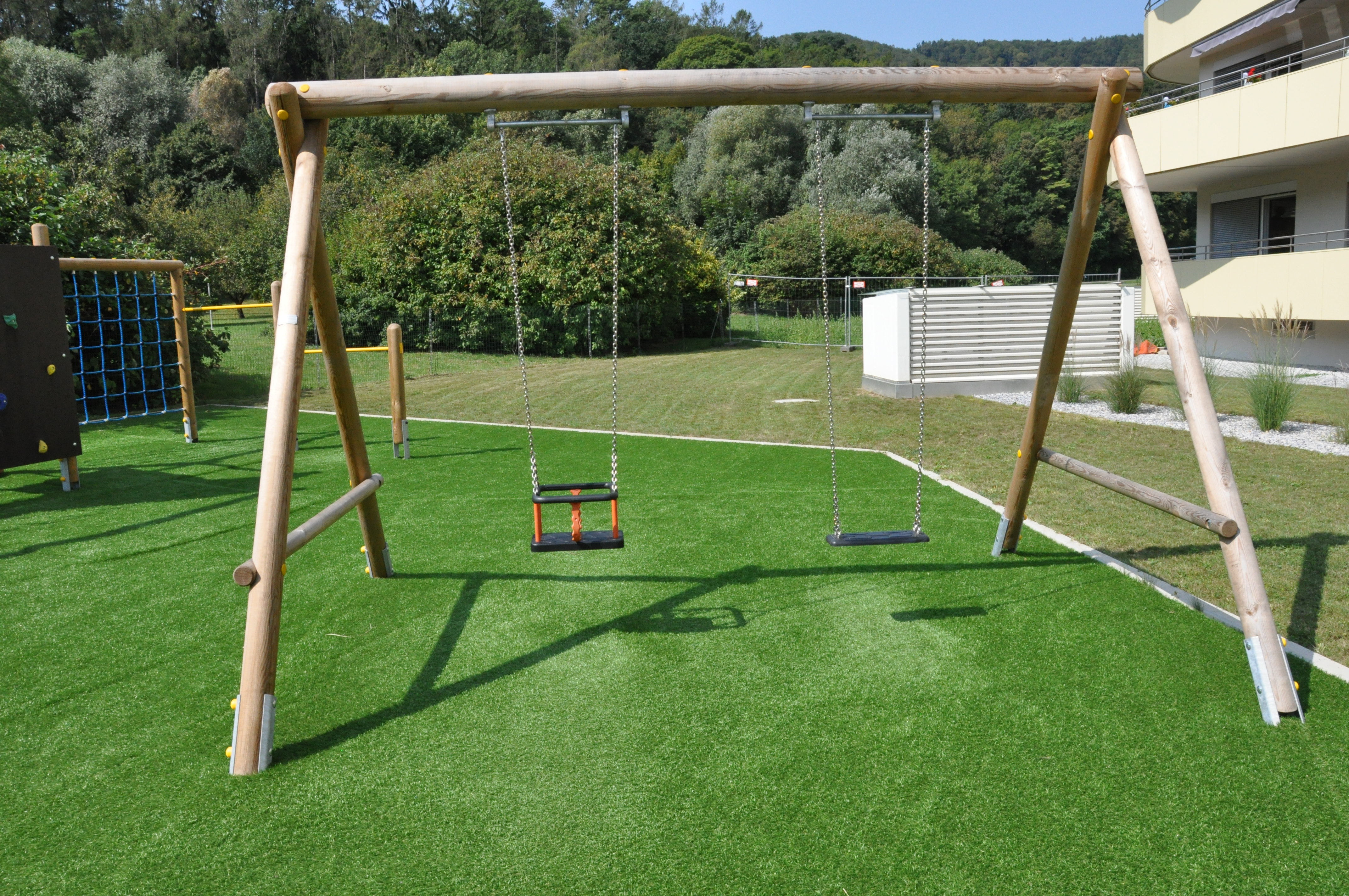 Die große Zweifachschaukel besteht aus zwei massiven A-Stützen und einem 4,0 m langen Schaukelbalken. Der Schaukelbereich ist seitlich durch Durchlaufsicherungen zwischen den A-Stützen abgeschirmt.