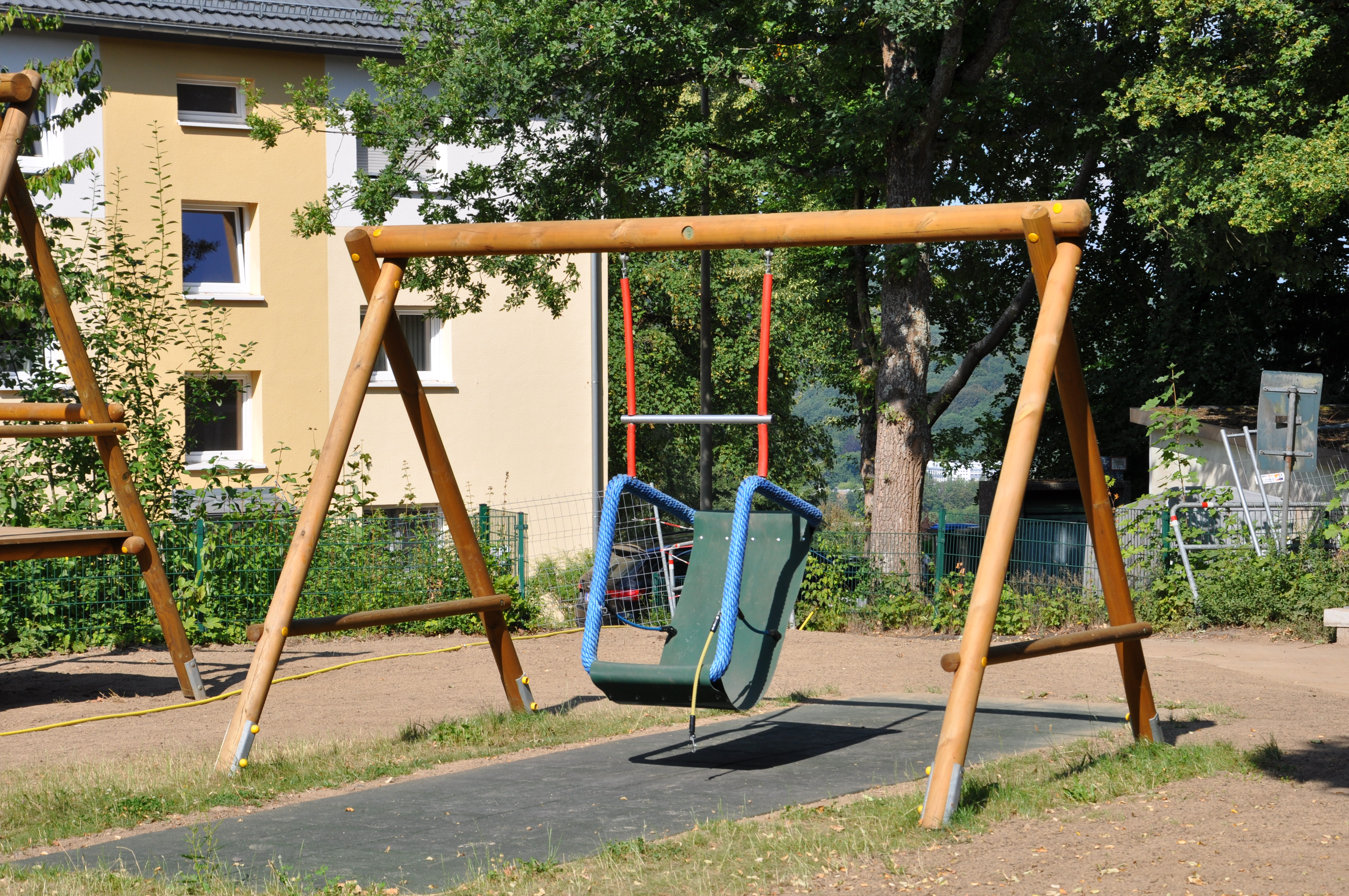 Die Swing4all Maxi-Schaukel besteht aus zwei massiven A-Stützen und einem 4,0 m langen Schaukelbalken aus Brettschichtholz. Der Schaukelbereich ist seitlich durch Durchlaufsicherungen zwischen den A-Stützen abgeschirmt.
