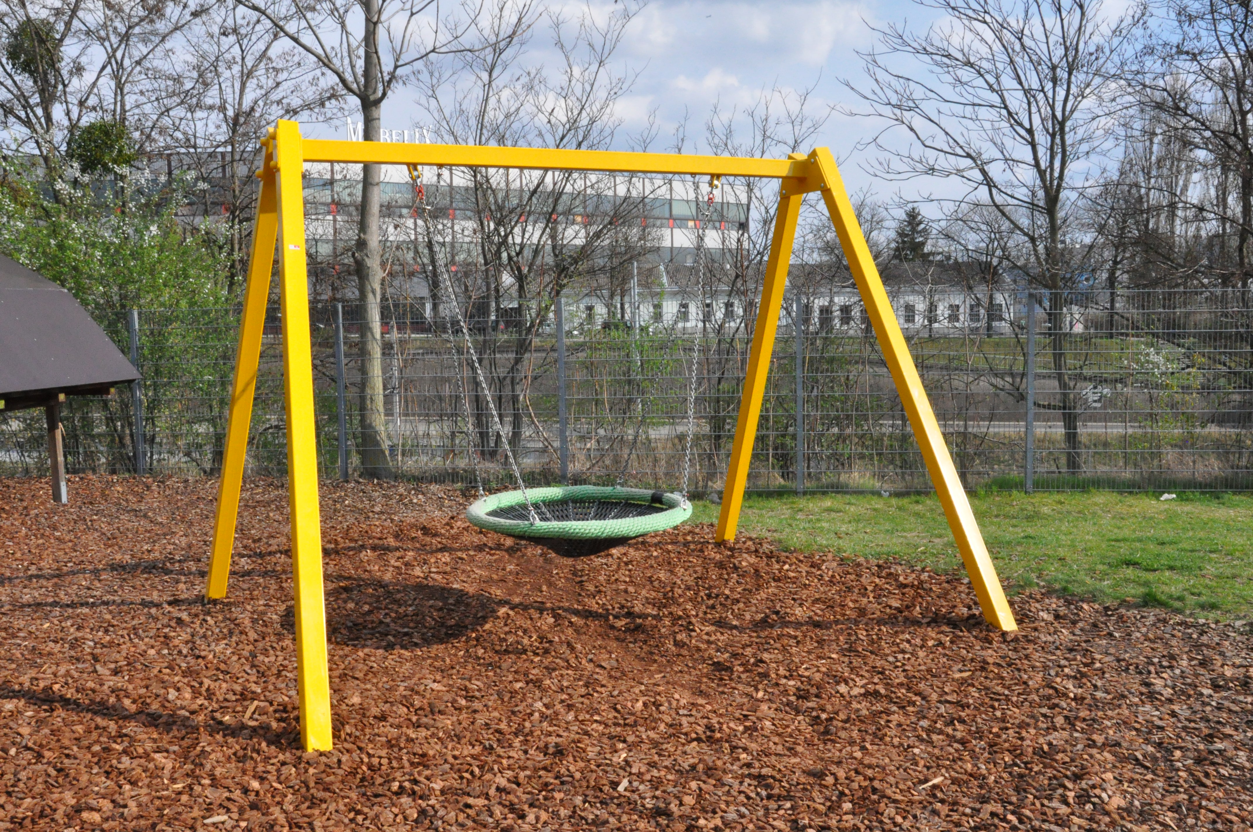 Die Nestschaukel besteht aus zwei Schaukelstützen aus Stahl-Formrohr, einem 3,0 m langen Schaukelbalken und einem abgehängten Vogelnest-Schaukelkorb. Die Stahlteile sind gelb pulverbeschichtet.