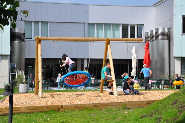 Die Ringschaukel besteht aus zwei massiven A-Stützen und einem Schaukelbalken. Einseitig ist der Schaukelbalken auskragend für eine weitere Schaukel. Der Schaukelbereich ist seitlich durch Durchlaufsicherungen zwischen den A-Stützen abgeschirmt.