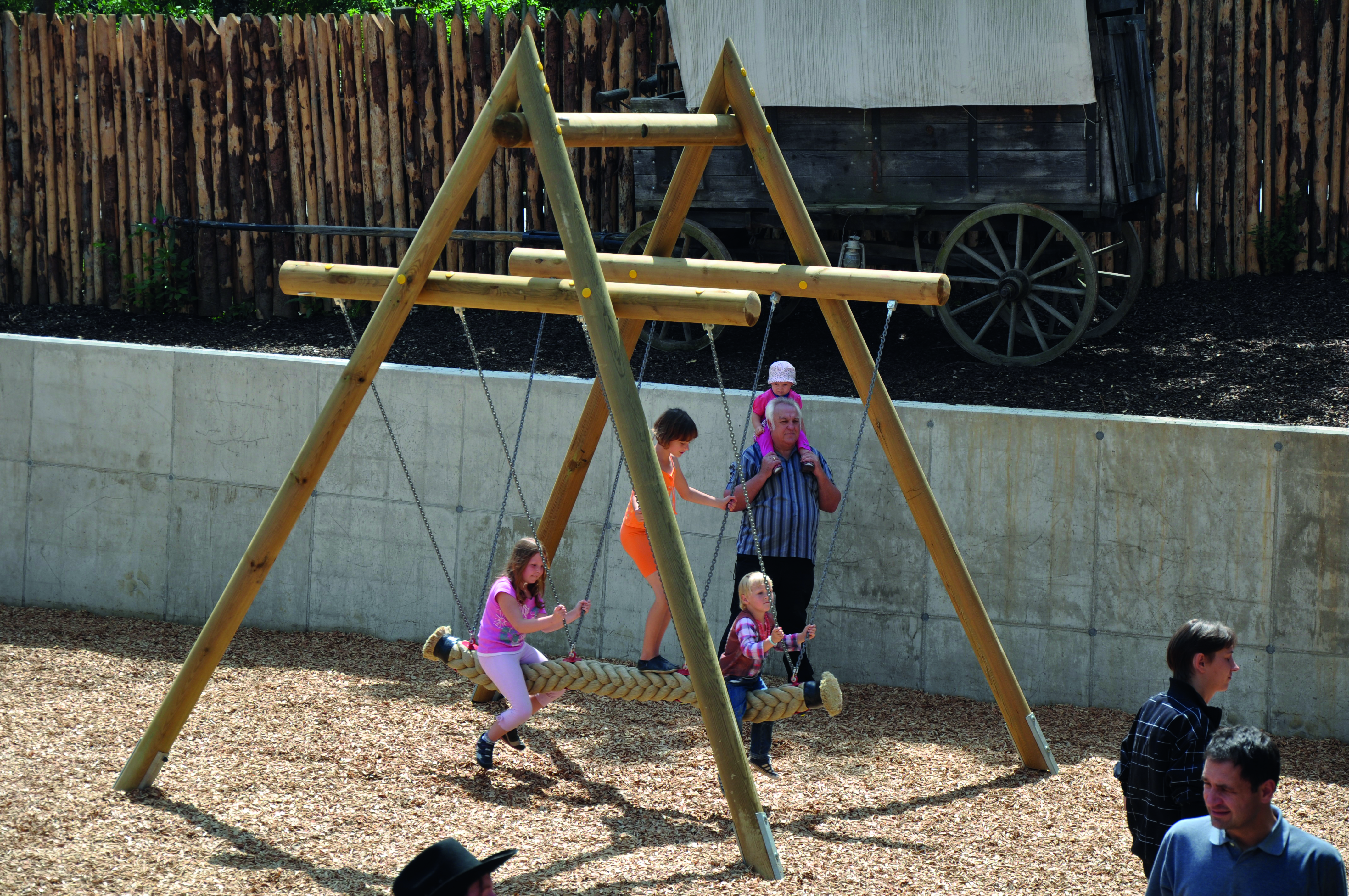 Große Schaukel aus massivem Holzgestell mit dickem Wikinger-Tau auf dem mehrere Kinder gleichzeitig schaukeln können.