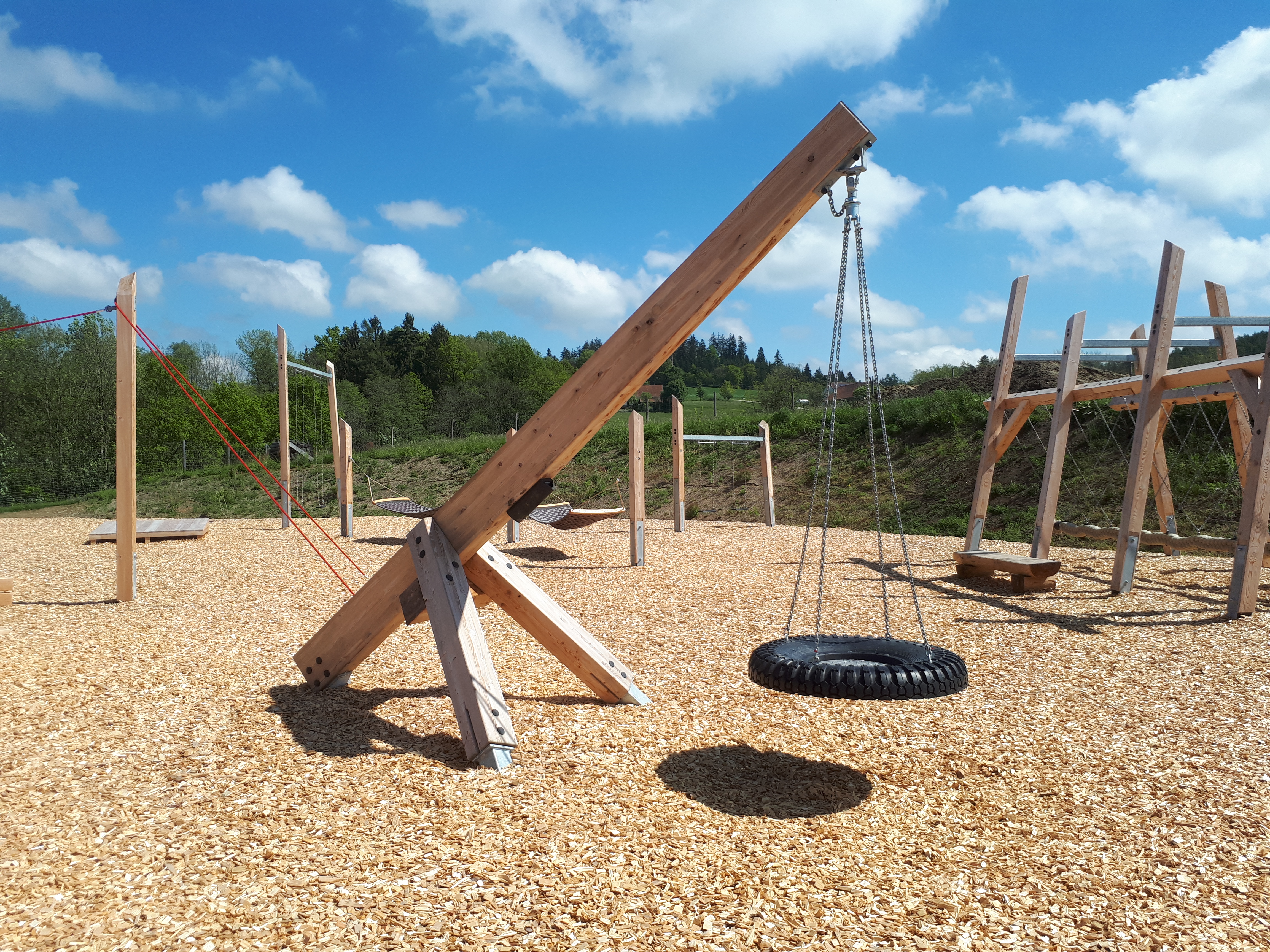 Die Leimbinder Pendelschaukel besteht aus einem massiven Leimbinderschaukelgerüst. Ein rechteckiger Leimbinder wird schräg in den Boden verankert und mit zwei ebenso rechteckigen Leimbindern abgestrebt. Am höchsten Punkt der Auskragung ist ein Reifenpendel angebracht, welches sich in alle Richtungen schaukeln lässt. Die Leimbinder Pendelschaukel besteht aus einem massiven Leimbinderschaukelgerüst. Ein rechteckiger Leimbinder wird schräg in den Boden verankert und mit zwei ebenso rechteckigen Leimbindern abgestrebt. Am höchsten Punkt der Auskragung ist ein Nestpendelkorb angebracht, welches sich in alle Richtungen schaukeln lässt.