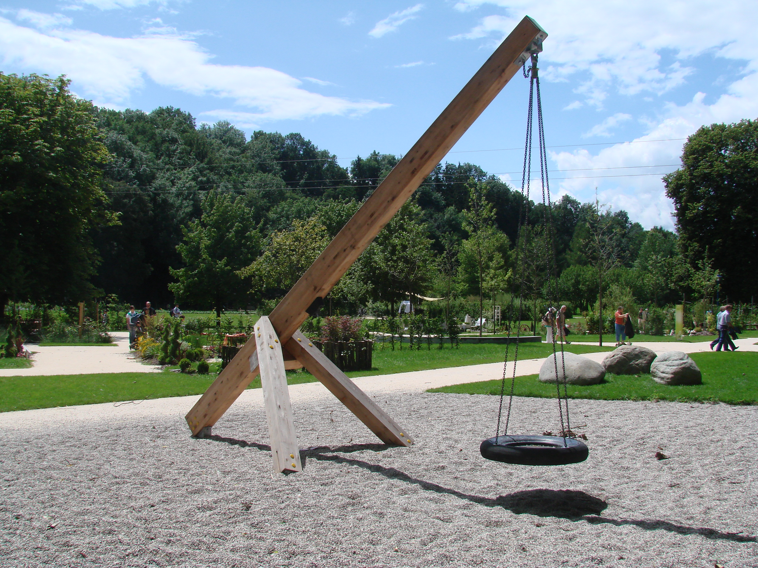 Die Leimbinder Pendelschaukel besteht aus einem massiven Leimbinderschaukelgerüst. Ein rechteckiger Leimbinder wird schräg in den Boden verankert und mit zwei ebenso rechteckigen Leimbindern abgestrebt. Am höchsten Punkt der Auskragung ist ein Reifenpendel angebracht, welches sich in alle Richtungen schaukeln lässt. Die Leimbinder Pendelschaukel besteht aus einem massiven Leimbinderschaukelgerüst. Ein rechteckiger Leimbinder wird schräg in den Boden verankert und mit zwei ebenso rechteckigen Leimbindern abgestrebt. Am höchsten Punkt der Auskragung ist ein Nestpendelkorb angebracht, welches sich in alle Richtungen schaukeln lässt.