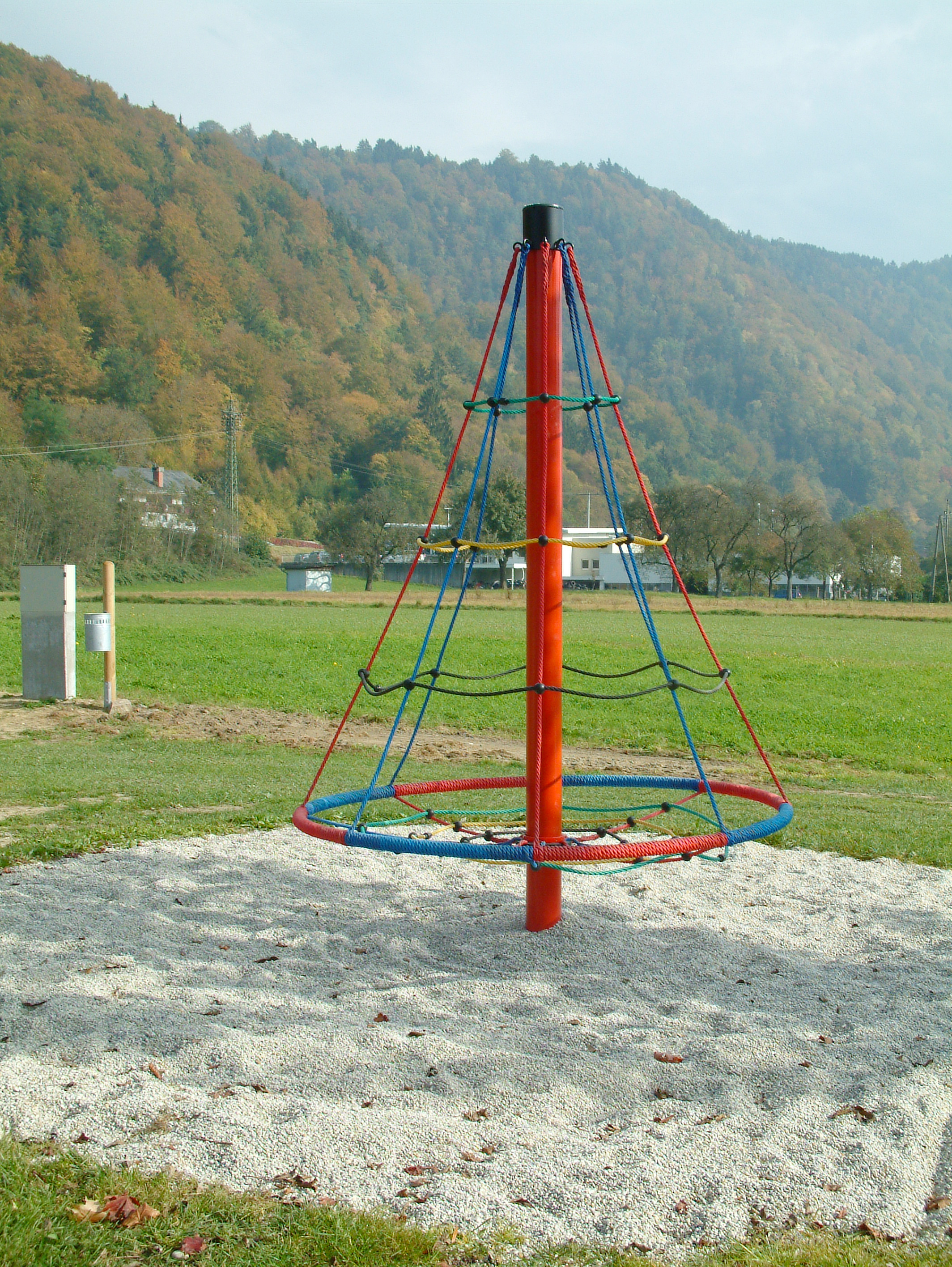 Ein mit Tau ummantelter Stahlring, welcher mit einem Netz bespannt ist, ist an einem kegelförmigen Netz an einem Stahlmast abgehängt. Der Ring samt Netzen ist drehbar an einem Stahlmast gelagert. So entsteht ein interessantes Kletterelement aus Tauwerk welches den Gleichgewichtssinn fordert.