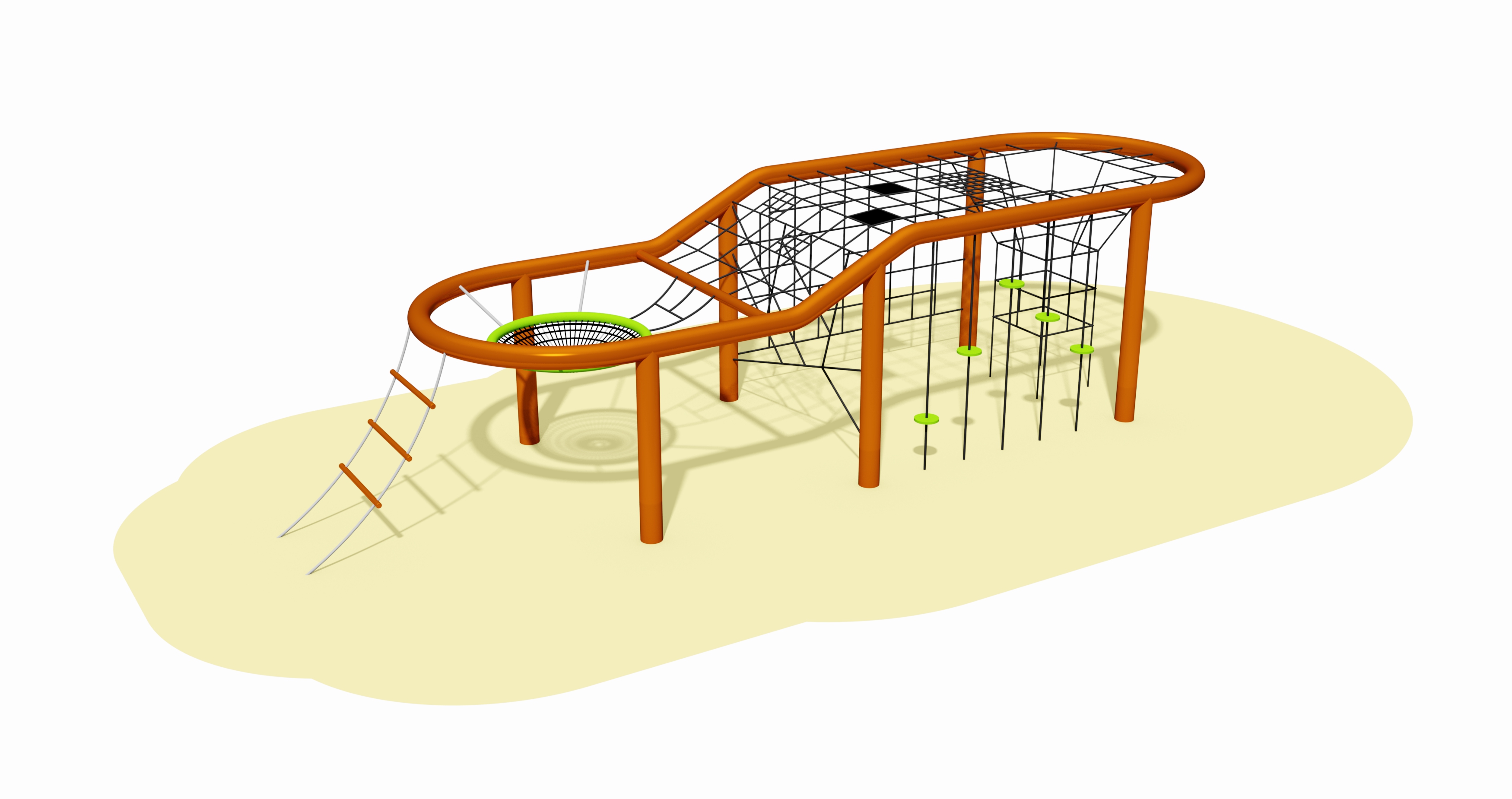 6 Standrohre, 1 Stahlrohr-Rahmen ca. 7,2 x 2,35 m, mehrteilig, mit Höhenverlauf, alle aus Stahlrohren Ø 168 mm x 4,5 mm Wandstärke, feuerverzinkt und pulverbeschichtet, Rohrverbindungen mit Einschubelementen aus Edelstahlblech 10 mm bzw. 15 mm stark, jeweils einseitig im Rohr verschweißt, 1 horizontales Flächennetz mit ungleicher Maschenteilung und 4 Membrane aus Gummigurt, 1 senkrechtes Kletternetz mit ungleicher Maschenteilung, 5 Klettertaue mit Discs Ø 20 cm aus HDPE-Platte 19 mm, 1 Seilgewirr zwischen 2 Standrohren, 1 Netztrichter, alle Seile und Netze aus Herkules-Tau 16 mm, 1 Nestkorb an Ketten abgehängt, 1 Sprossenaufstieg mit Stahlrohren.