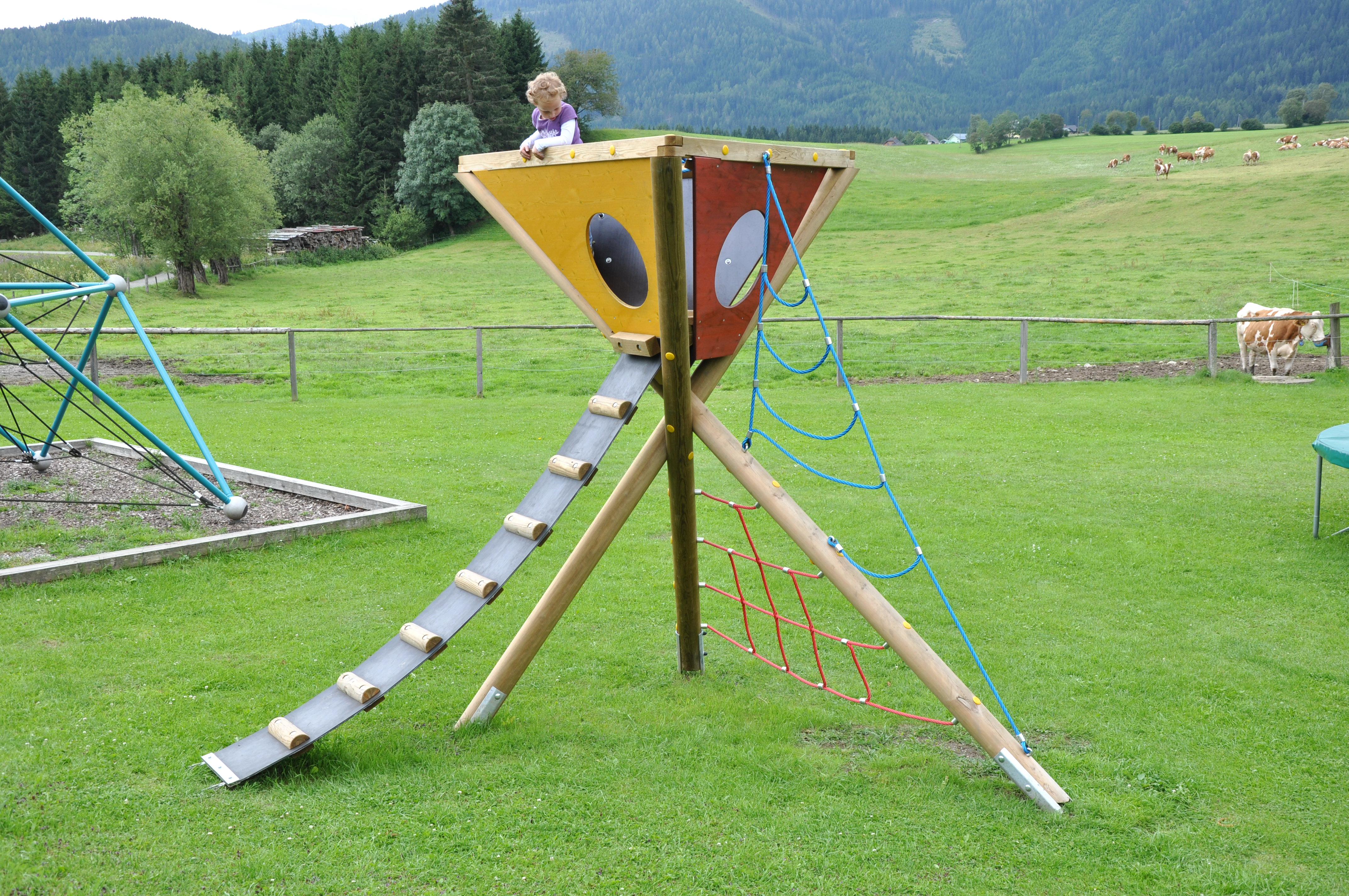 Beschreibung: 3 Steher (Pfosten) Ø 14 cm, oben 1 Netzrahmen aus Kanthölzer 9/9 cm, 1 Hercules-Dachnetz mit Dreiecksmaschen, 1 überhängende Bergstei- ger-Kletterwand mit angeschraubten Klettergriffen und Schlupfloch, 2 Wände aus Schichtholzplatte 20 mm, gelb und rot getaucht, 1 Podest mit Unterzügen aus Kant- hölzern 9/9 cm, Belag aus Kanthölzern 3,5/10 cm, 1 Gummiband-Aufstieg mit Halb- hölzern, 1 Hercules-Dreiecksnetz.