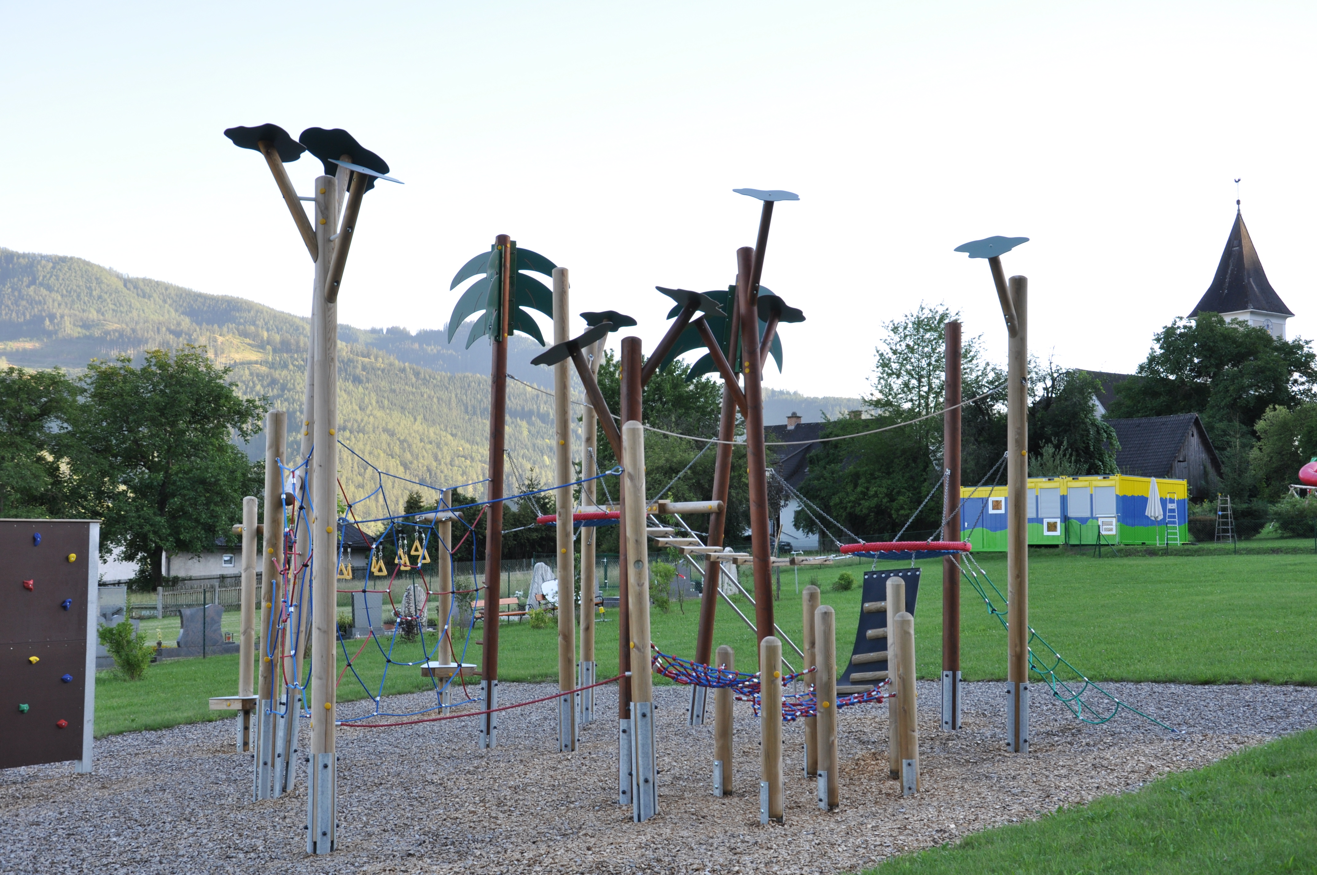 Beschreibung: 11 Steher (Pfosten) aus Brettschichtholz Ø 16 cm, davon 1 Stk. mit Aufstiegssprossen eingebohrt, 7 Steher aus Rundhölzern Ø 14 cm, kernge- trennt, 2 kleine Herkules-Spinnennetze, Ø ca. 130 cm, 1 Herkules-Verbindungsnetz, 2 große Herkules-Spinnennetze (7 bzw. 5 m²), 1 Herkules-Netzaufstieg, alle Netze aus Herkulestau Ø 16 mm, 6 Herkules-Haltetaue Ø 22 mm, 1 Gurtband-Aufstieg mit aufgeschraubten Kletterleisten, 2 Nestkörbe aus Stahlrohr mit Seilumwickelung und Gurtgeflecht, an Ketten abgehängt, 1 Balken-Ketten-Übergang, 2 Rutschstangen aus Edelstahlrohr, 10 Äste mit Blättern aus Ø 10 cm Rundhölzern und grüner HPL-Platte, 6 Palmwedeln aus grüner HPL-Platte.