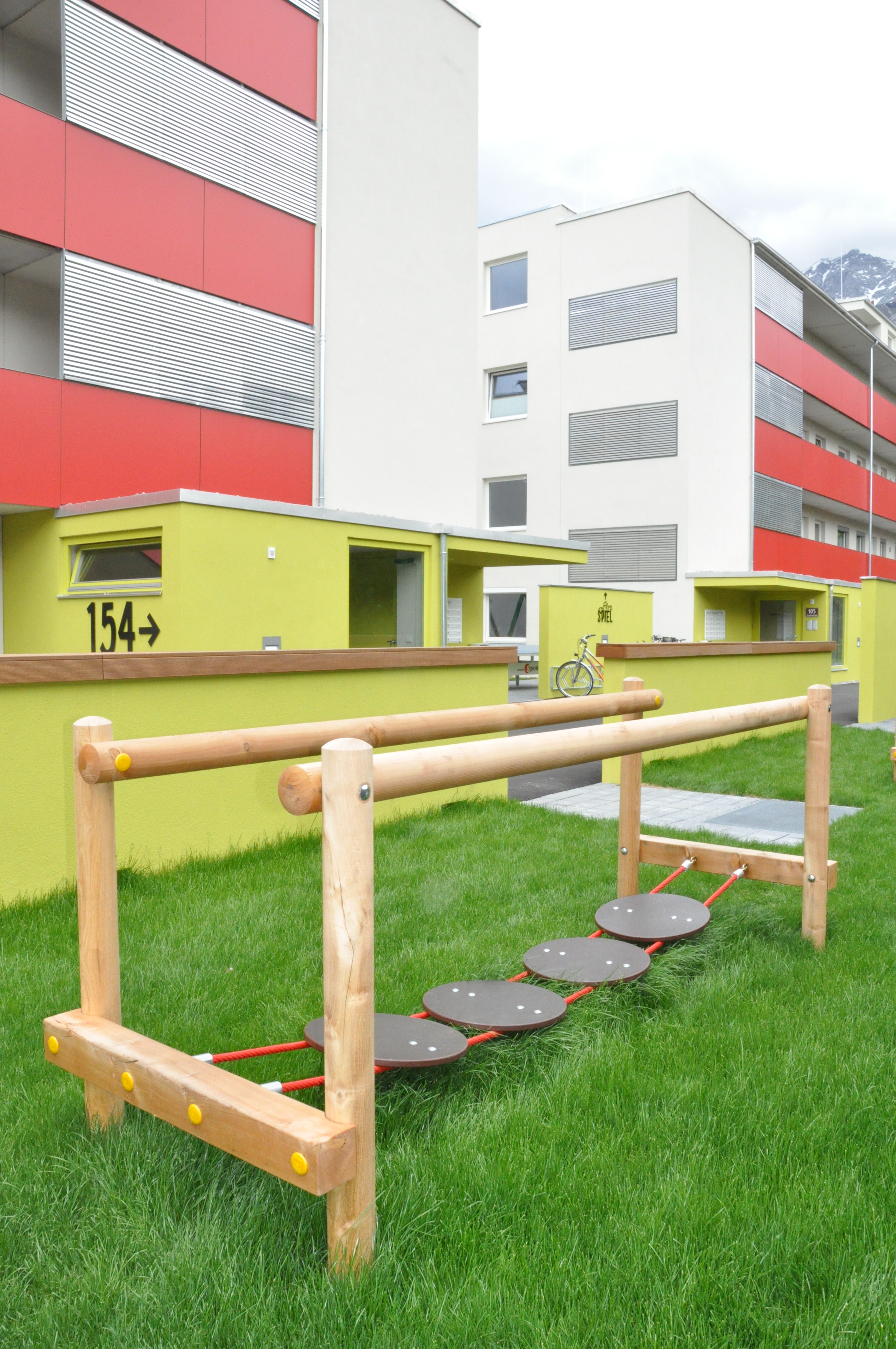 Beschreibung: 4 Steher (Pfosten), Eiche Ø 10 cm, 2 Längshölzer Ø 10 cm, 2 Querbalken aus Kanthölzern 11/11 cm, 1 Wackeltellerbrücke, mit 2 längslaufenden Herku- lesseilen Ø 22 mm, beweglich, mit 4 kreisrunden Wackeltellern aus Siebdruckplatte, zum Schutz der Seile mit Laschen geklemmt.