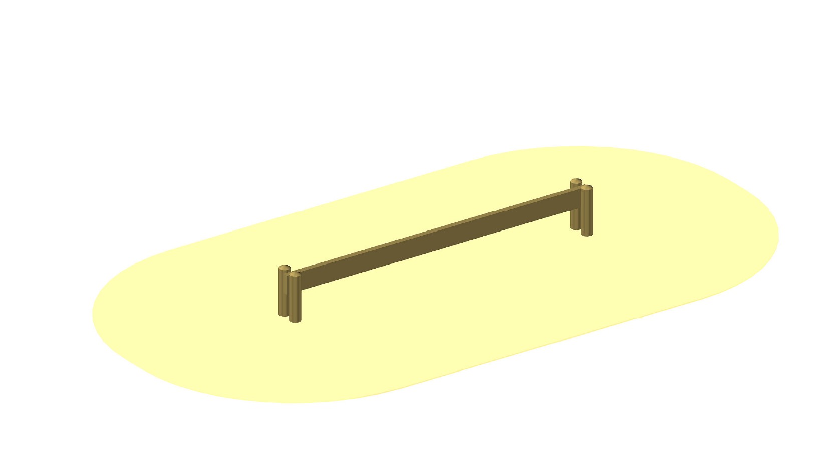 2 längs laufende Kanthölzer 2,5x17 cm miteinander verschraubt, kerngetrennt (kernfrei), an den Enden mit je 2 Stehern Ø 10 cm, Eiche, verschraubt.