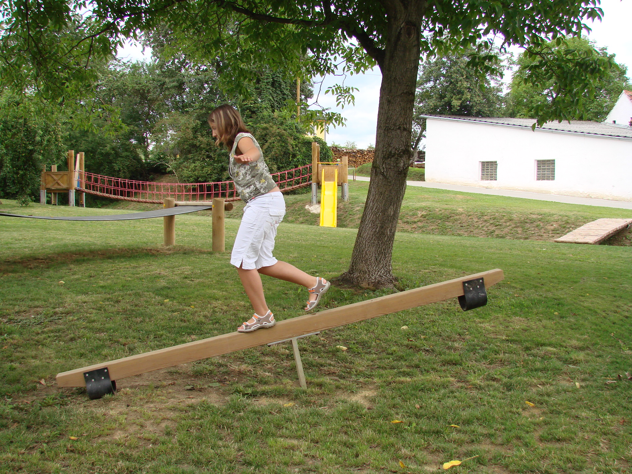 Beschreibung: 1 Wippbalken aus Kantholz 9/11 cm, Gummischlaufen zur Stoßdämpfung an beiden Enden, Lagerbock aus Stahl, verzinkt, Wippenachse mit Gleitlagerung.