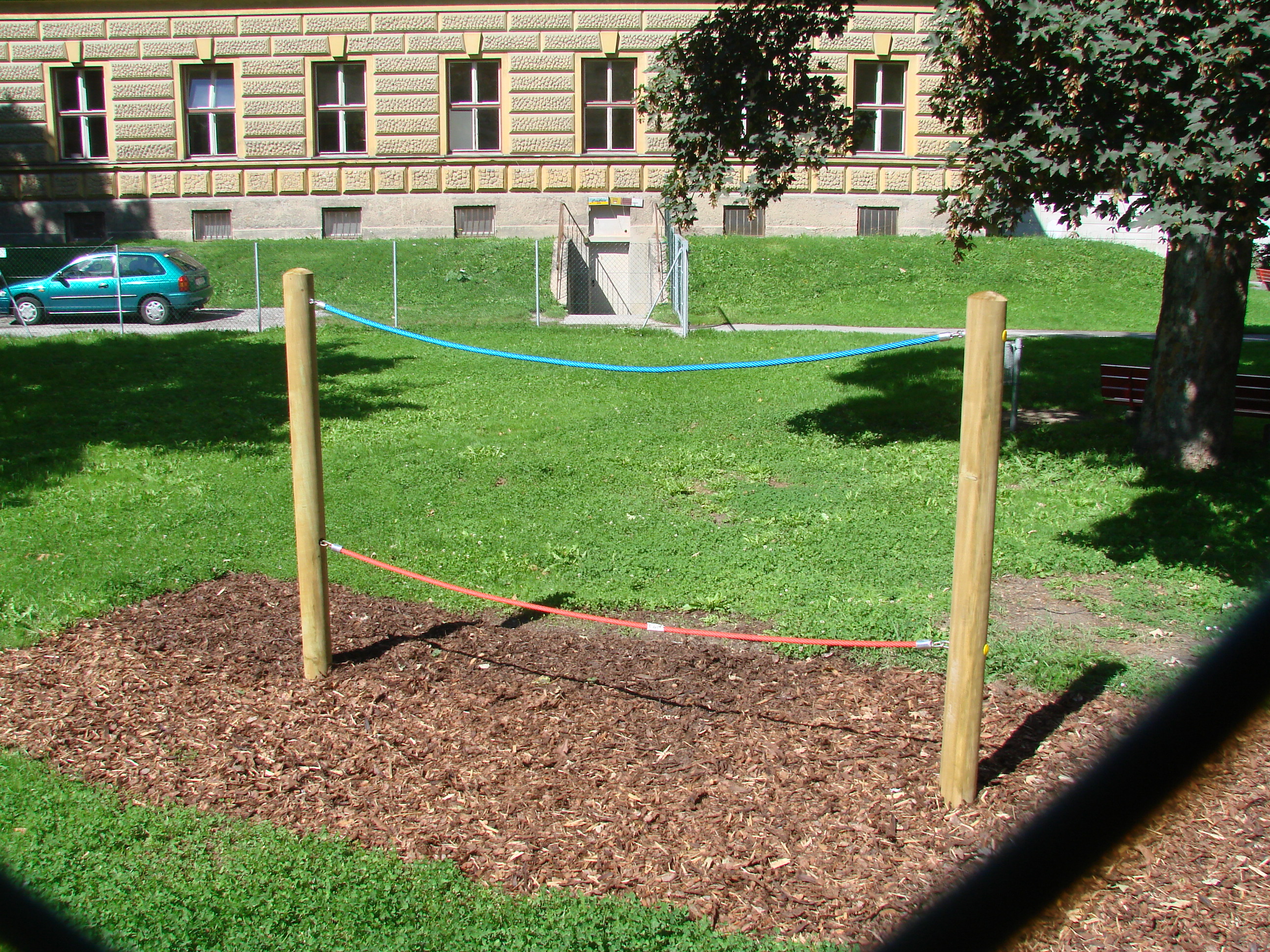Beschreibung: 2 Steher (Pfosten) Ø 14 cm, 1 Herkules-Balanciertau, beweglich, 1 Herkules-Haltetau, mit Gewindestiften verpresst und durchgeschraubt.