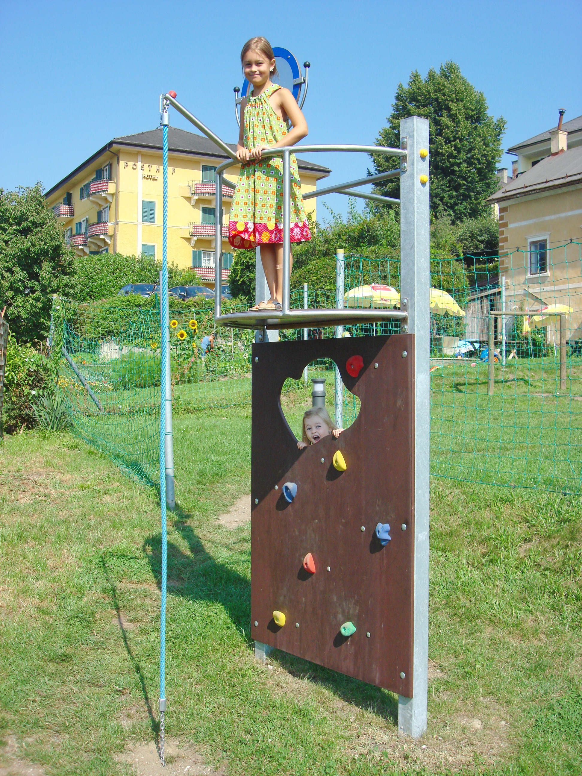 Beschreibung: 2 Steher aus Formrohr 100/100/4 mm, feuerverzinkt, 1 Balkon mit Boden aus Siebdruck- platte, 1 Herkules-Klettertau, 1 Feuerwehrstange, 1 Spiegel beweglich, aus Edelstahl, 1 Kletterwand aus Siebdruckplatte, 1 Seite mit Bergsteiger-Klettergriffen, 1 Seite mit Kletterleisten, verschraubt.
