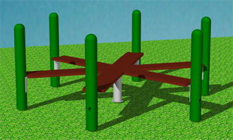 Beschreibung: 7 Steher (Pfosten), Rundhölzer Ø 12 cm, Sitzbretter aus Kanthölzern, 4/23 cm, an 6 Winkelkonsolen und 1 Knotenblech mit Stahlstehern, verzinkt, aufgelagert. Bei Best.Nr. 68986: zusätzlich 1 Zeltdach, 1 Wimpel drehbar.
