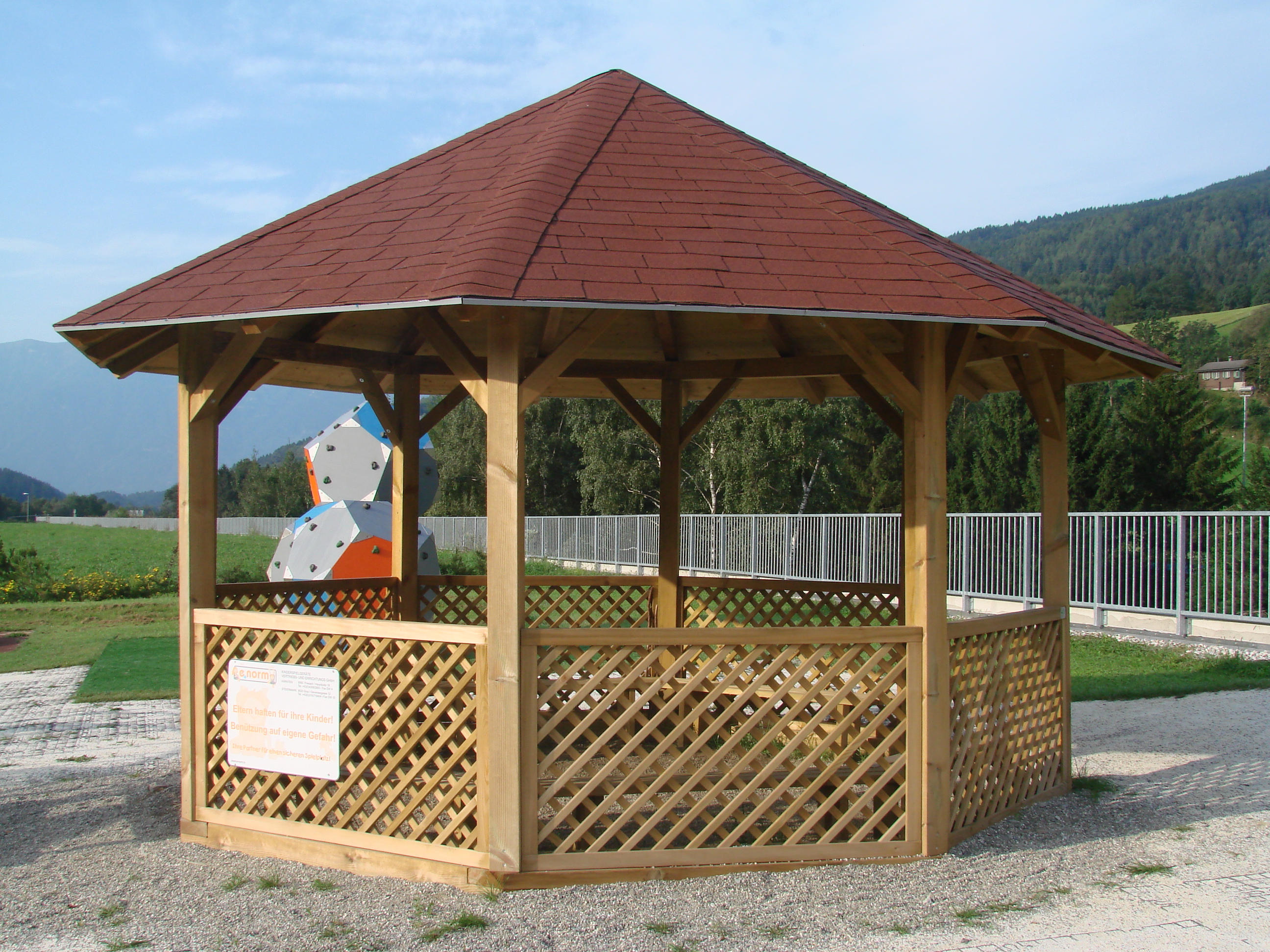 Beschreibung: Pavillon komplett mit vorgefertigten Wandelementen, Dach-Elementen, Sitzbänken sowie Bodenverankerungen, Dacheindeckung nach Wahl, mit Bitumen-Dachschindeln oder mit verzinktem Blech. Bodenkranz wird auf Streifenfundamente auf- gedübelt.