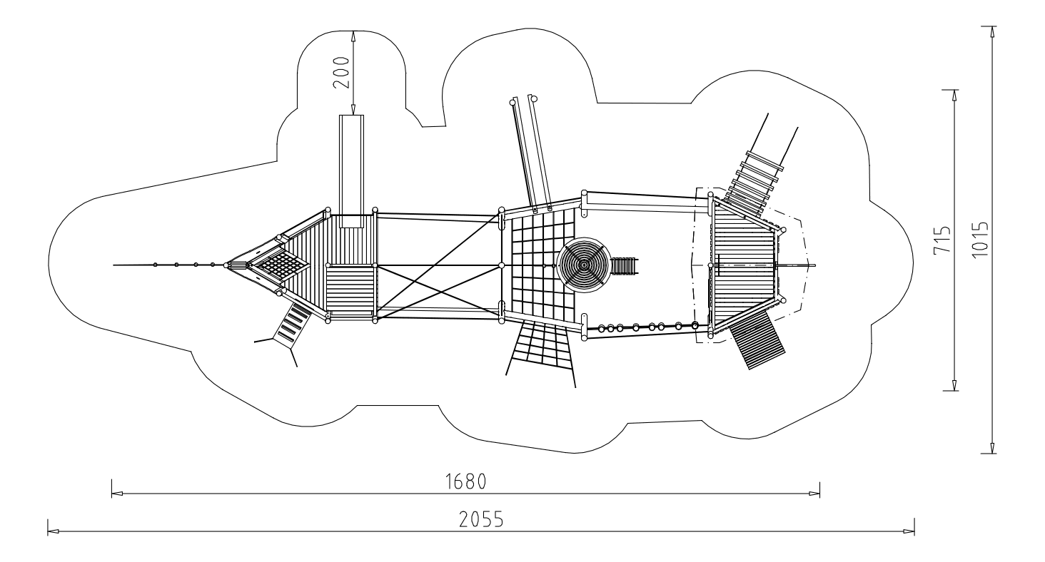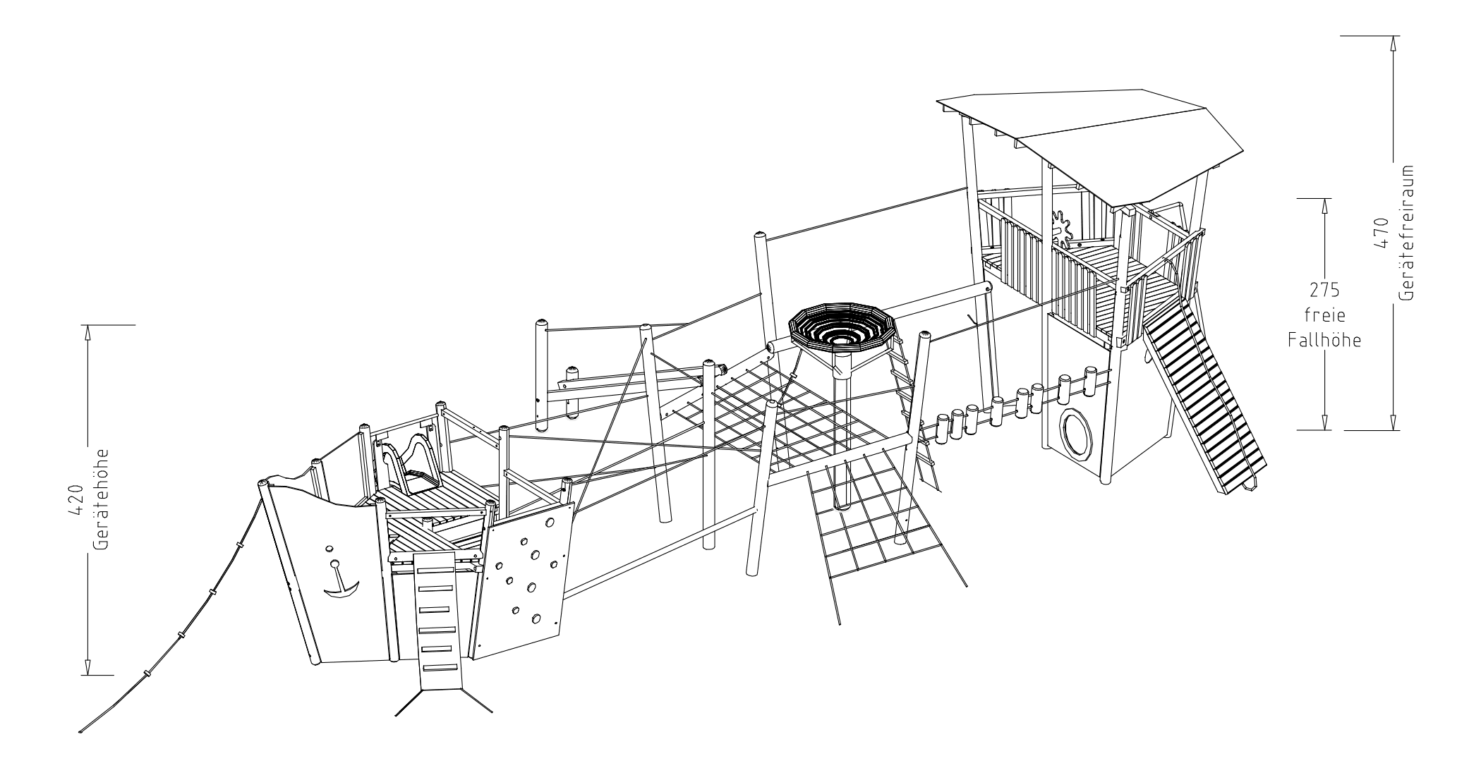 Beschreibung: 16 Steher (Pfosten) aus Rundhölzern ∅ 12 cm, 5 Steher aus Rundhölzer ∅ 14 cm, alle kerngetrennt (kernfrei), 1 Rundholz ∅ 20 cm, Kernholz, 3 Podest mit Unterkonstruktion aus Kanthölzern (KH) 9/9 cm und 9/11 cm, geblattet, 1 rautenförmiges Herkules- Netz, ca. 75/75 cm im Bug-Podest eingesetzt, 1 Herkules-Fl chennetz ca. 270/150 cm, 1 Herkules-Aufstiegsnetz, alle Herkules-Netze aus ∅ 16 mm Herkulestau, 11 Stk. Balancier- bzw. Haltetaue aus Herkulestau ∅ 22 mm, 1 Balanciertau   70 mm, 1 Krähennest mit Stahlhülse und Kragarmen und Nestkorb mit Seilumwicklung am Stahlring, 2 Klettertaue, 1 Strickleiter, 1 Balancierelement „Pfahlkette“ aus 2 Herkulestauen ∅ 22 mm mit 8 Stk. aufgefädelten Rundhölzern ∅ 14 cm, 1 Balancierbalken aus Rundholz ∅ 14 cm, 1 Dach aus HPL-Platte 8 mm, Pfetten aus KH 9/9 cm, Sparren aus KH 3/9 cm, 1 Feuerwehr- Kletterstange, Edelstahl, 1 schiefe Ebene mit Anhalteseil, 1 Balken-Kettenaufstieg, 1 Bergsteiger-Kletterwand, 1 Gummiband-Aufstieg, 1 Sprossenwand, Verkleidungen aus 3-Schichtplatte 20 mm sowie KH 3/9 cm, diverse kreisrunde Ausschnitte in den Brüstungen, 2 Schlupfl cher mit Verstärkungsring aus Siebdruckplatte 20 mm, 2 stilisierte Anker aus Siebdruckplatte 20 mm, 1 Absturzsicherung für Rutsche, 1 Spielwand mit Sitzbank, 1 Sitzbank an Verkleidungsplatte.