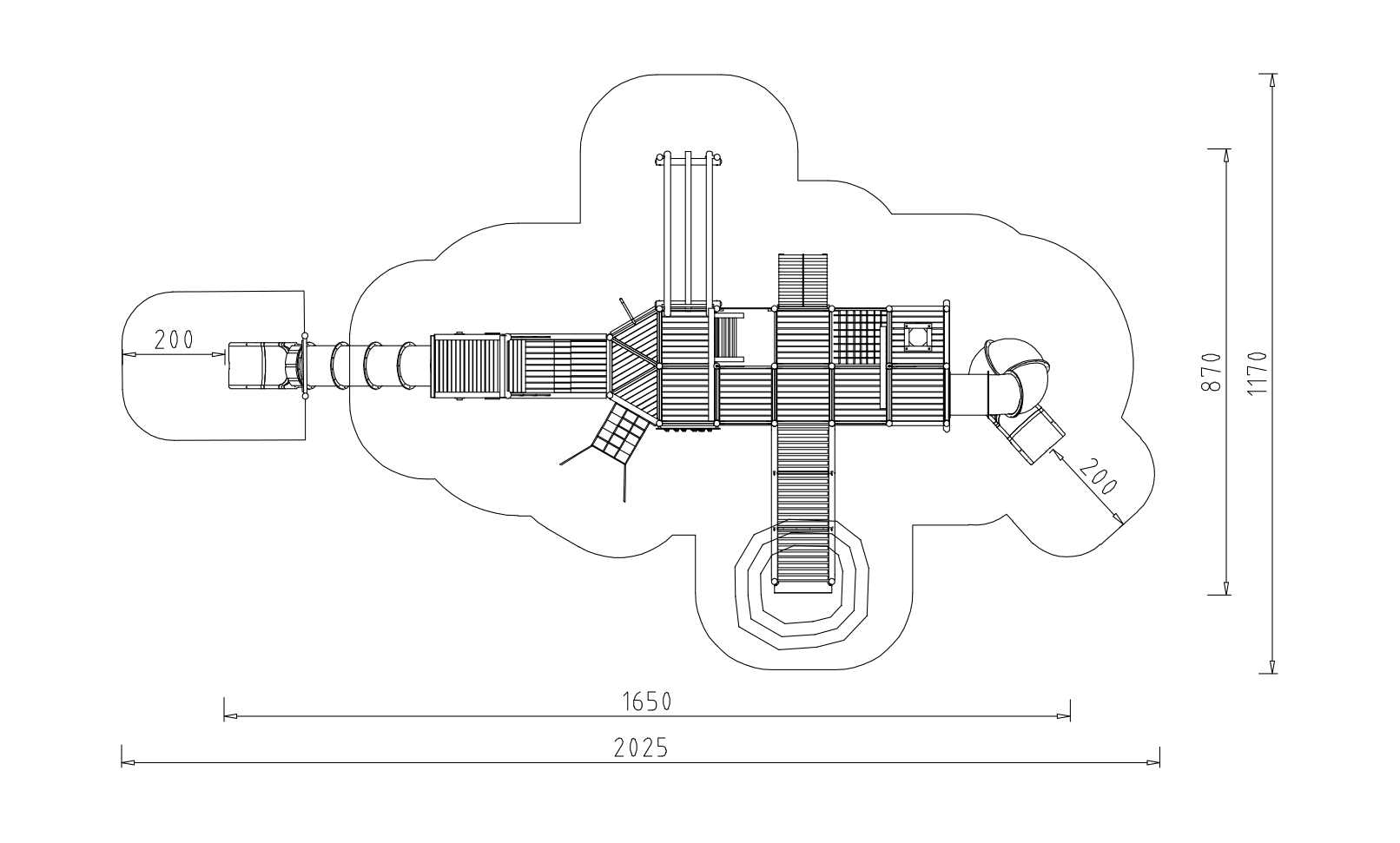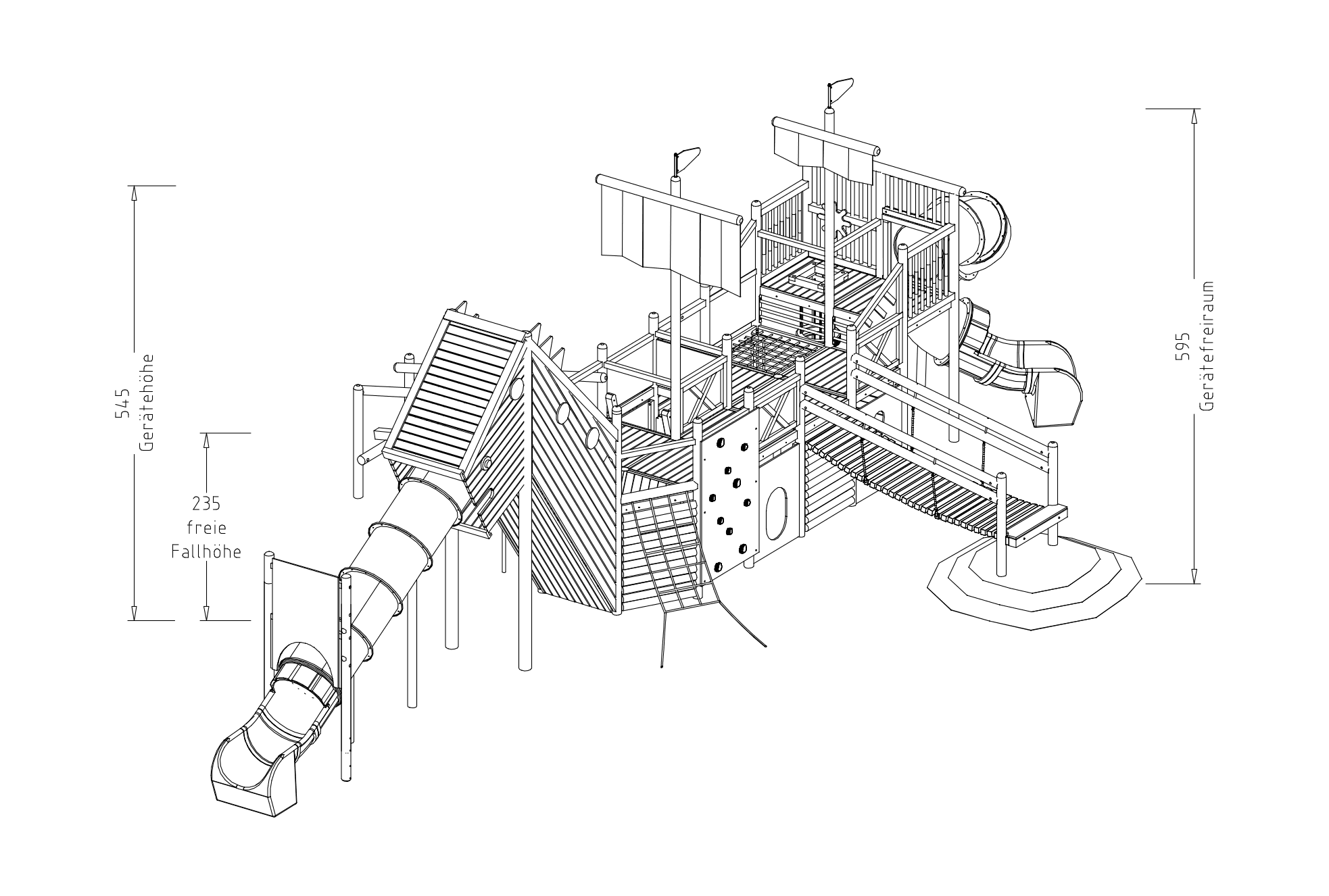 Beschreibung: 22 Steher (Pfosten) aus Rundhölzern Ø 12 cm, 2 Masten aus Leimhölzer Ø 12 cm, mit 2 Segel, Drachenkopf, mit Podesthöhe 2,5 m, geeignet für Röh- renrutsche, mit Stützkonstruktion aus Rundhölzern Ø 16 cm, Schiffsdeck aus Systempodesten, 8 quadra- tisch, 3 dreieckig, mit Leiter-Abgang unter das Deck, 1 Podestnetz, 1 erhöhtes Schiffsheck, mit Steuerrad drehbar, aus Siebdruckplatte, 1 Reifen-Trichter, 1 An- schlussmöglichkeit für Röhrenrutsche im Heck, bei-derseits 4 verschiedene Brücken und schräge Aufstiege auf das Deck, Ein- und Ausgänge in den Schiffsrumpf, im Rumpf labyrinthartig angeordnete Spielwände.