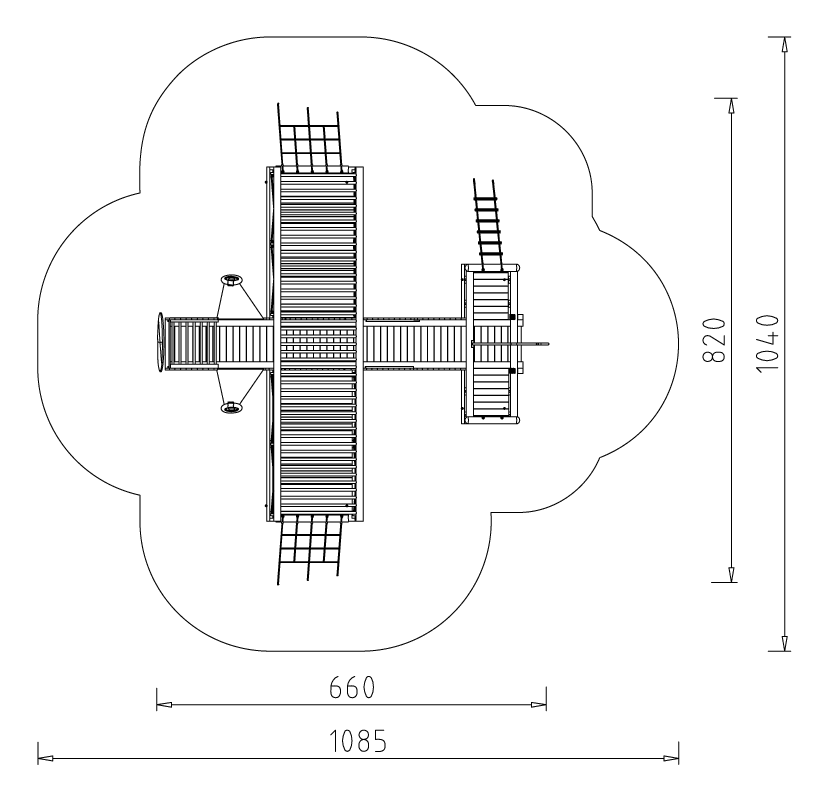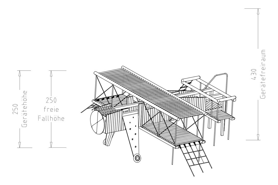 Beschreibung: Der Doppeldecker ist ein Oldtimer-Flugzeug, das gut für Rollenspiele ge- eignet ist und zahlreiche Klettermöglichkeiten aufweist. Hauptkonstruktion aus Rundhölzern Ø 12 cm und Kanthölzern 11/11 cm, Rumpf-Verkleidung aus Kanthölzern 3/9 cm, Rumpf-Boden aus Kanthölzern 4/11 cm, Fallschutzplatten im Rumpf, 2 Fahrwerk-Aufstie- ge aus Siebdruckplatte mit Klettergriffen, 2 Netzeinstiege zur unteren Tragfläche, 1 Klet- terstangen-Aufstieg am Heck, 1 Strickleiter führt zum Heckflügel, die obere Tragfläche besteht aus Stahlrohren und ist somit keine Standfläche, die Propellerscheibe ist drehbar.