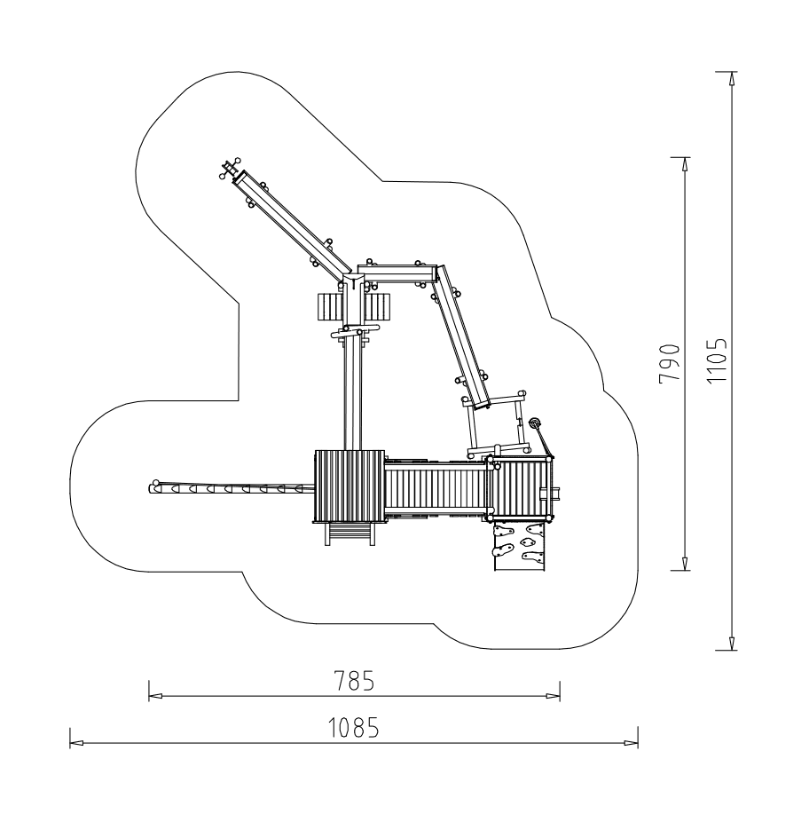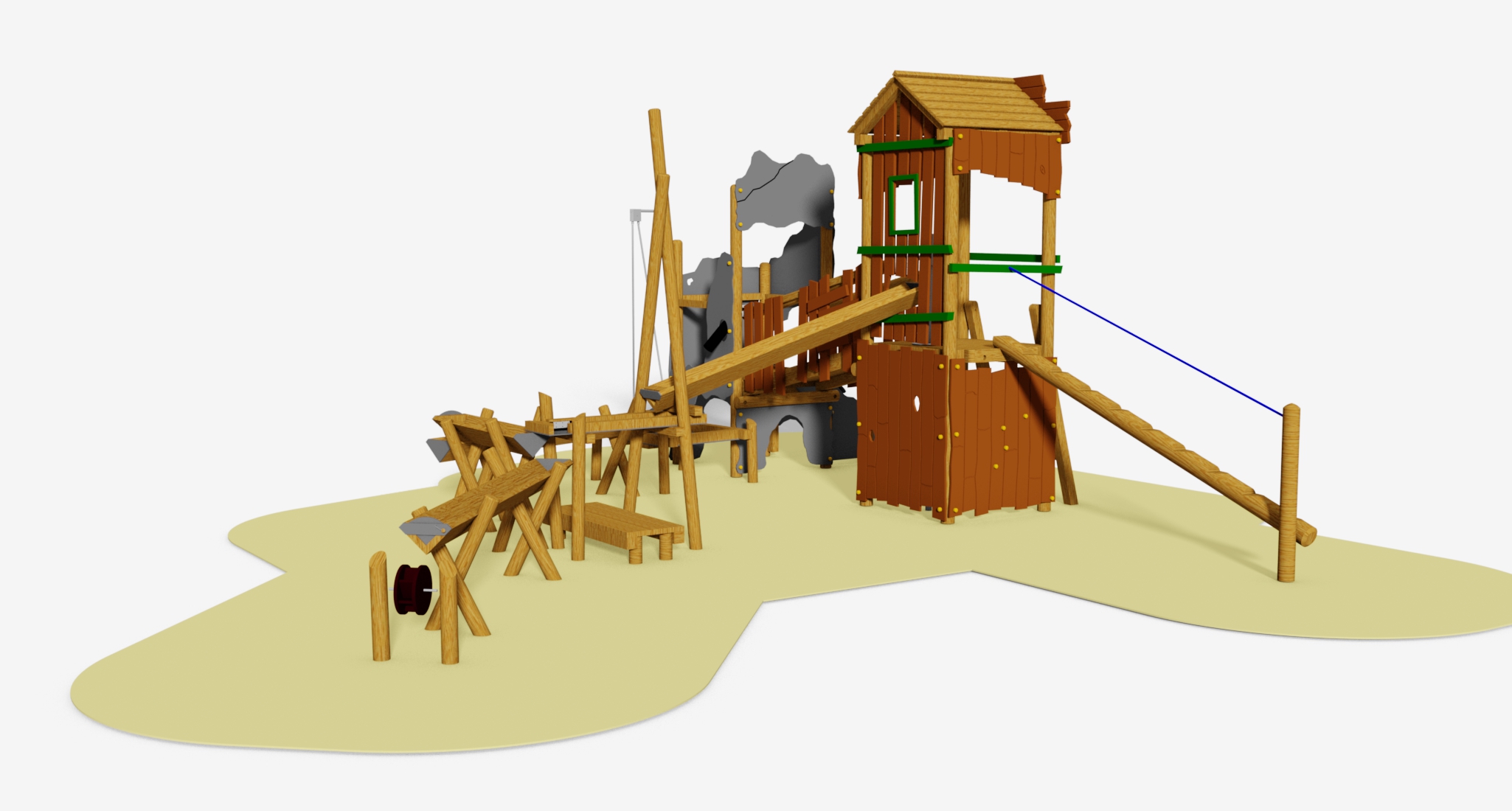 Die kleine Mine besteht aus einem Sandspielturm in Bergoptik, einem Kletterturm mit Pumpe sowie angeschlossener Sand- und Wasserspielanlage.