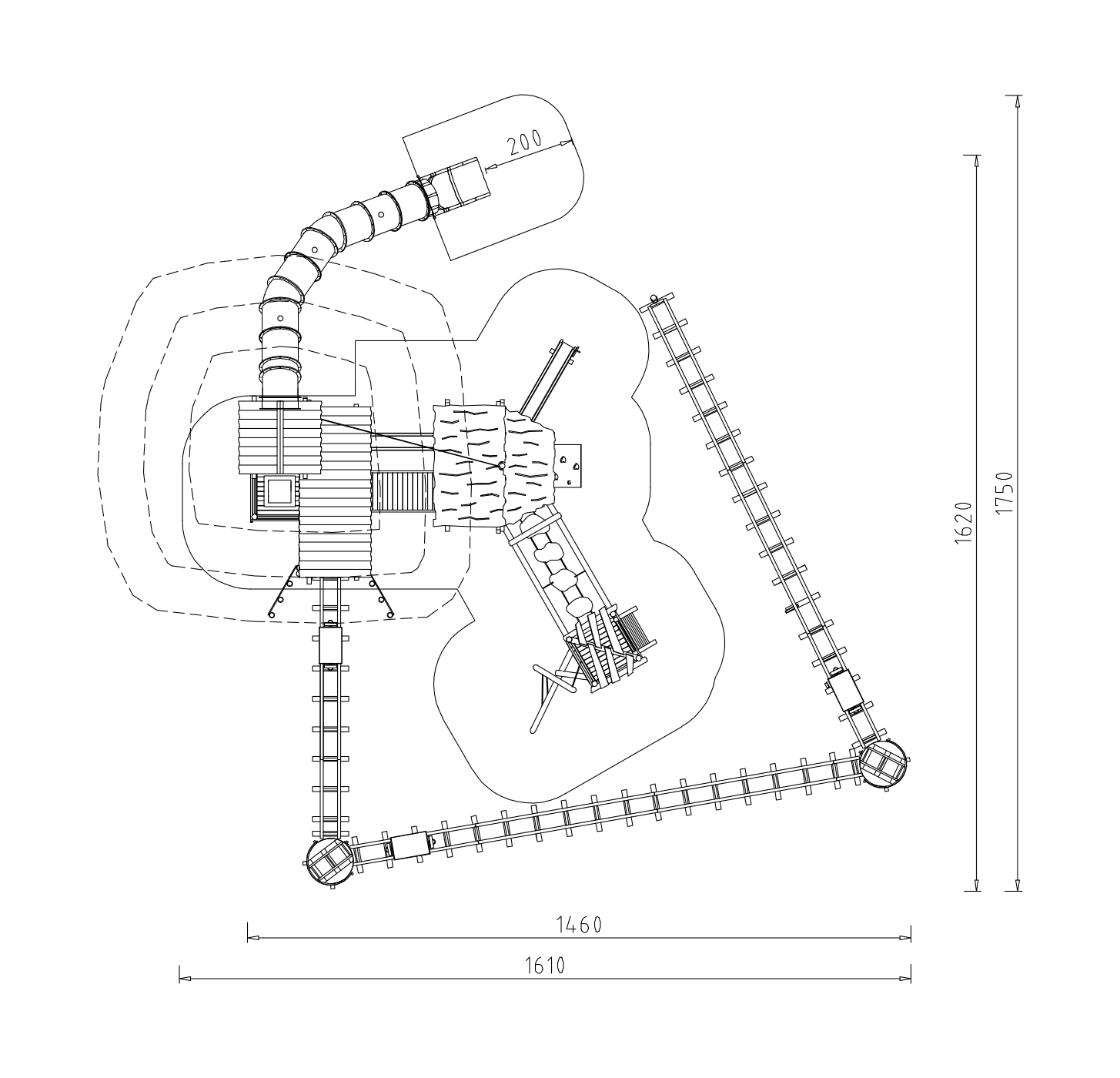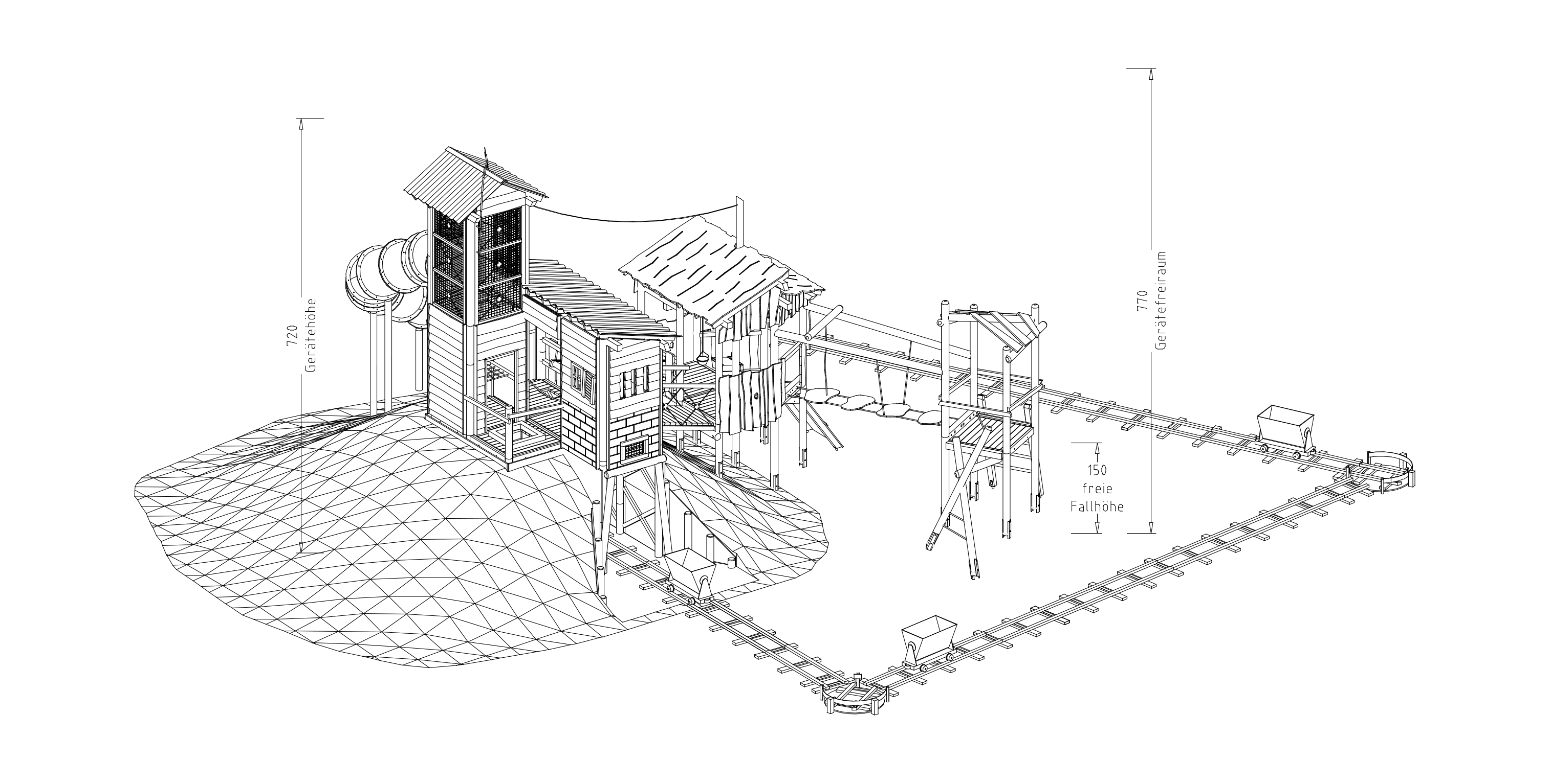 Beschreibung: 23 Steher (Pfosten) aus Rundhölzern Ø 12 cm, 9 MAXIMO Viereck- Podeste, 2 Stk. davon mit Durchstieg, 3 MAXIMO Dreieck-Podeste, 1 Fixbrücke schräg, tragende Konstruktion und Verkleidung aus Stahl, feuerverzinkt, 1 Leiter, 1 Stangen-Kletteraufstieg, 1 Wackelteller-Brücke, 1 Bergsteiger-Kletterwand schräg, 1 Herkules-Netztrichter, 2 Herkules-Netzpodeste ca. 100x50 cm, feinmaschig, 9 Stollenwände aus 3-Schichtplatte 20 mm mit Aussteifungskreuzen, 1 Abtrennwand im Stollen aus 3-Schichtplatte 20 mm, ca. 17 m² Kellermatte, 1 Stollenportal mit seitlichen Stützwänden aus 3 Schichplatte 20 mm und Pollern, 2 Sandförderbänder, 1 Sandtransport, 1 Sandtrichter mit Sieb, 2 Sitzbänke, 2 Pultdächer aus 3-Schichtplatte mit Intaglio-Fräsungen, 1 Pultdach sowie 1 Giebeldach mit Wellblech-Eindeckung, Verkleidungen teilweise aus 3-Schichtplatte mit Intaglio-Fräsungen, teilweise mit 3-Schichplatten mit aufgeschraubten sägerauen Brettern, gerollt, teilweise mit 8 mm HPL-Platte mit Intagio-Fräsungen, Turm im oberen Teil mit Stahl-Fachwerk und feinmaschigem Stahlgitter verkleidet, diverse Designelemente und Farbakzente, 1 Zahnrad-Paneel.
