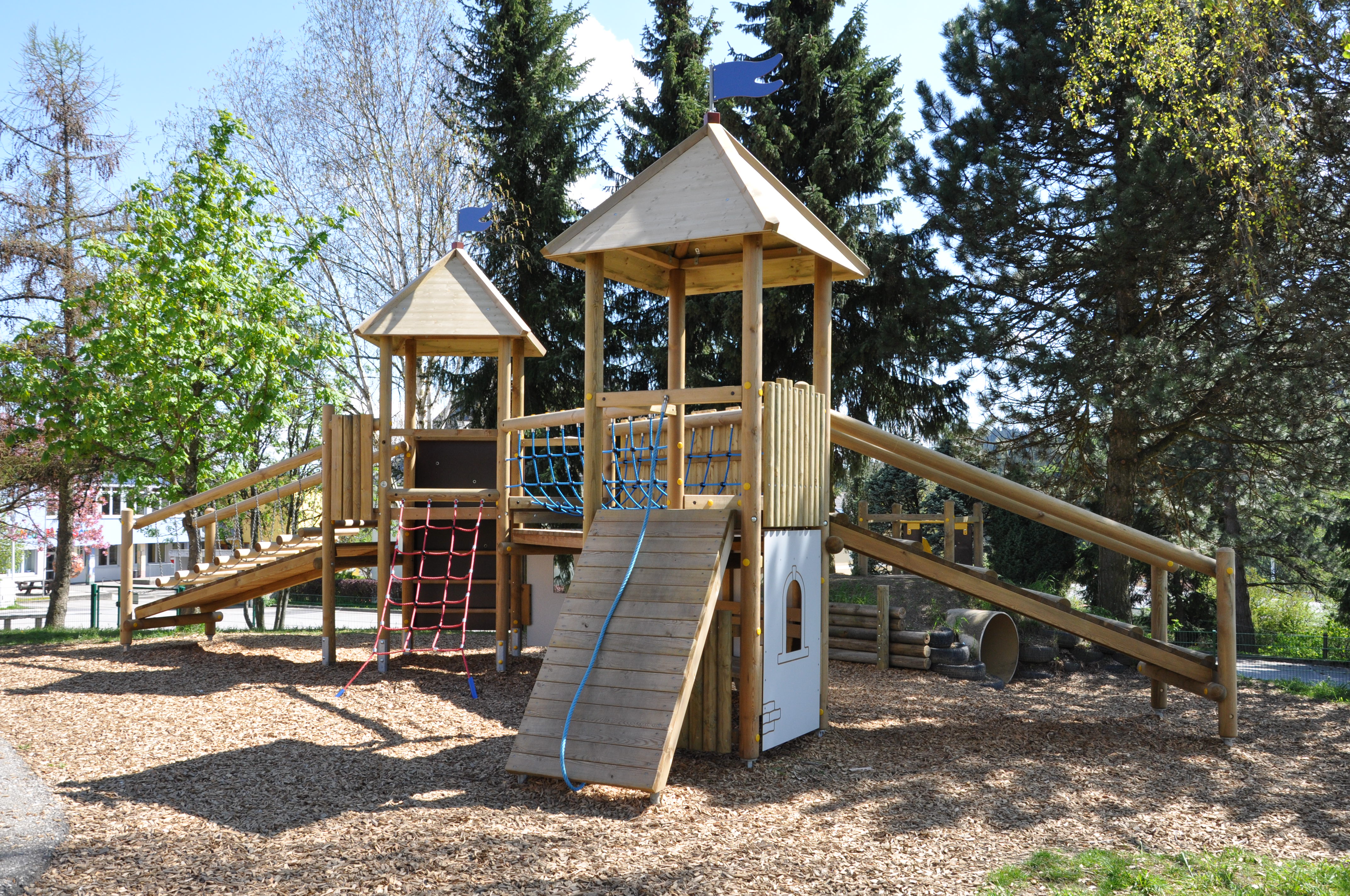 Diese Turmanlage ist im Burgdesign gestaltet und bietet neben fünf verschiedenen Kletter- und Aufstiegsmöglichkeiten auch zwei Brückenaufgänge. So kann die Kletterburg mithilfe einer Feuerwehr-Kletterstange, einer schiefen Kletterebene, einer Sprossenwand, den Netz-einstieg ohne Rahmen oder auch über die Bergsteiger-Kletterwand erklommen werden. Zwei Türme sind mit einer Netzbrücke verbunden. Die gesamte Anlage ist mit Verkleidungen und Brüstungen im Burgdesign ausgestattet.