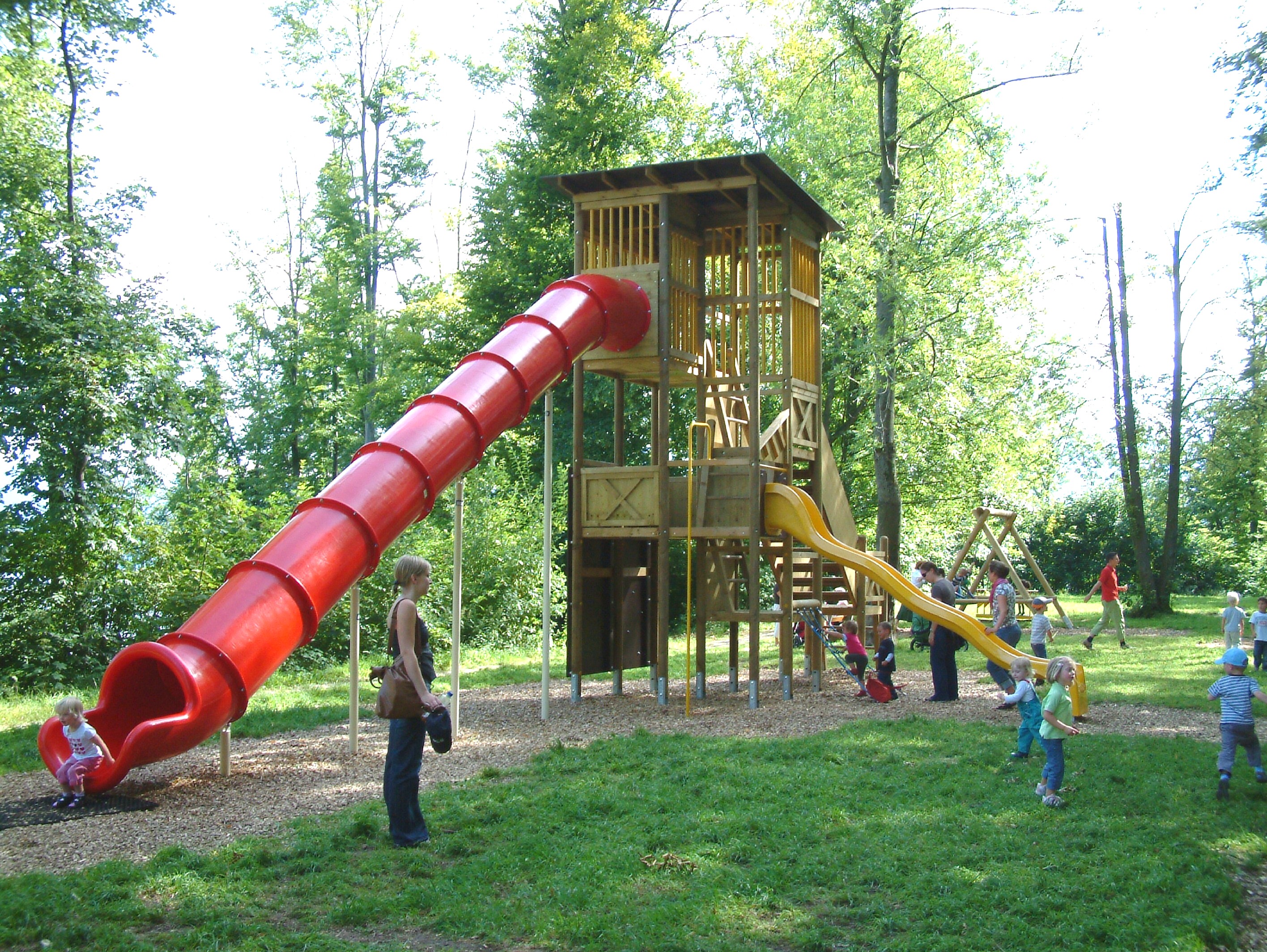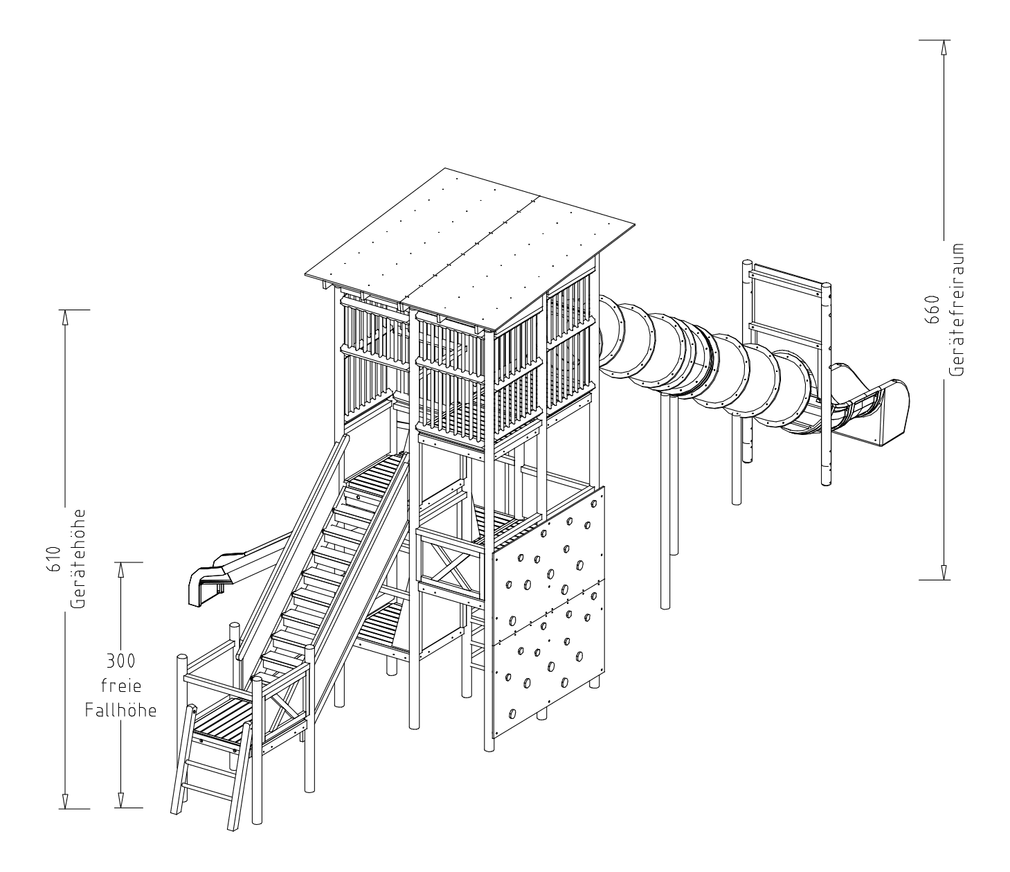 Beschreibung: Der Tower hat Podeste im Ab- stand von 1 m, die bis in 4 m Höhe reichen. Die Treppe beginnt auf einem Podest in 1 m Höhe und führt bis in eine Höhe von 3 m. Die senkrechte Kletterwand, mit Bergsteigerklettergriffen, führt in eine Höhe von bis zu 2,70 m. Der Tower bietet Anbaumöglichkeiten für Rutschen mit 2 m Anbauhöhe und Röhrenrutschen mit 4 m Anbauhöhe.