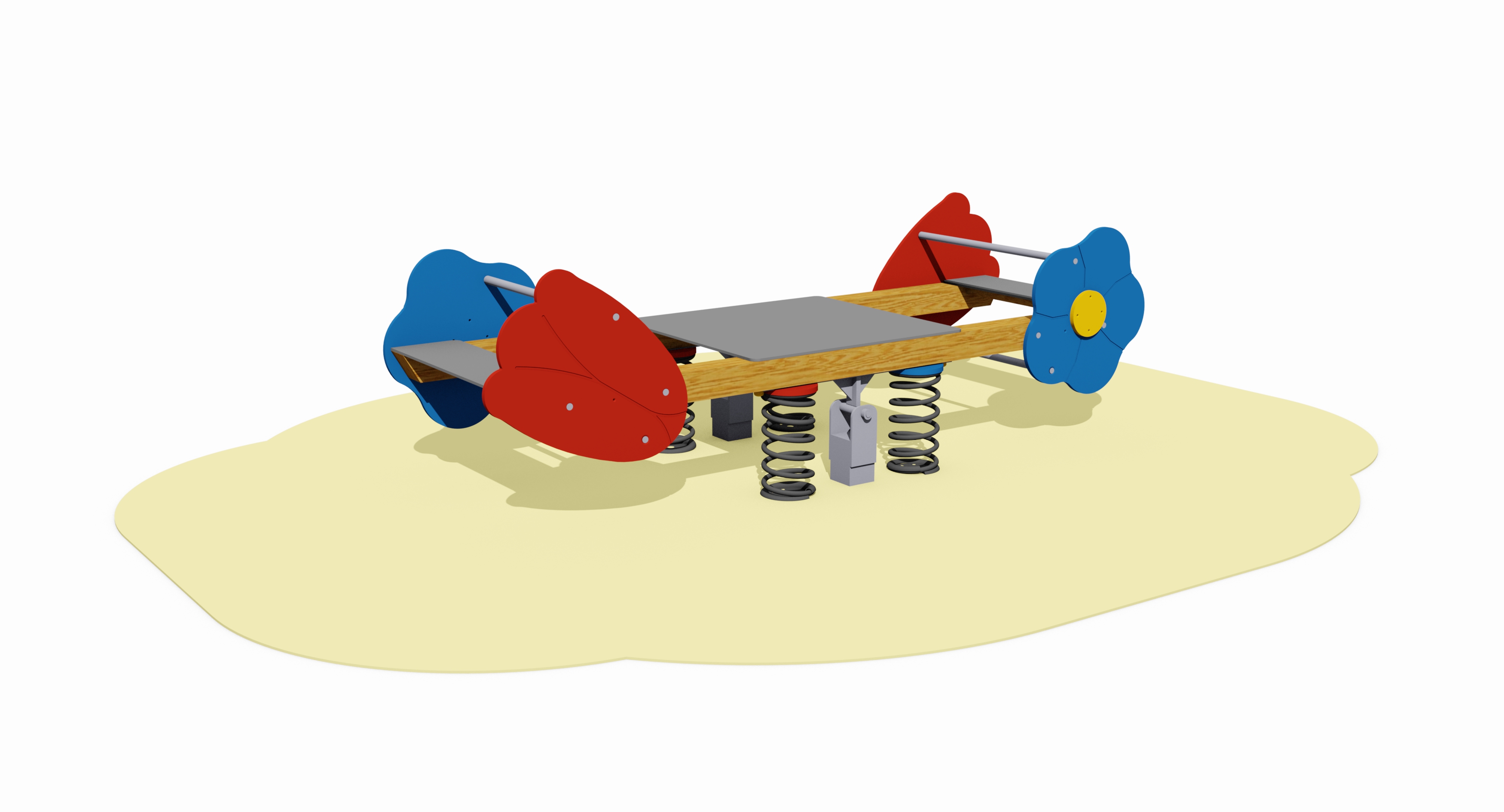 Die Blumenwippe ist aufgrund ihrer Größe für das gleichzeitige Benützen von mehreren Kindern geeignet. Die zwei gegenüber liegenden Sitzbereiche sind mit einer Fußraste und einer Haltestange ausgestattet. Auf der Fläche in der Mitte können weitere Nutzer sich sitzend, liegend, kniend oder stehend hin un her wiegen lassen.