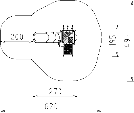 Beschreibung: Einturmanlage, bestehend aus einem Viereckturm ohne Dach, mit Rutsche, Treppenaufstieg schrägem Einstiegsnetz und einer Spielwand mit Bullauge.