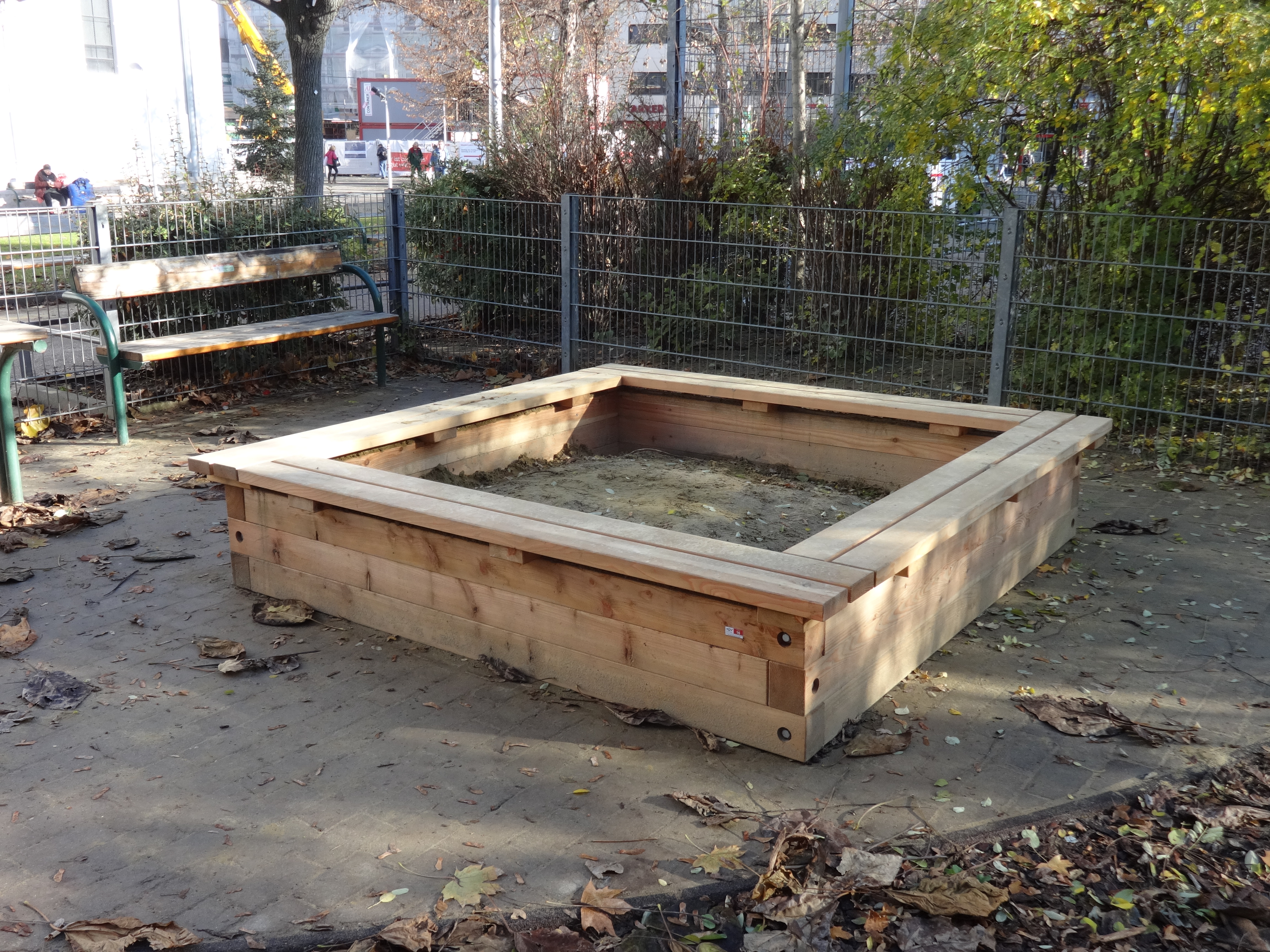 Der Kantholzsandkasten besitzt eine massive Verschraubung der Einzelteile. An allen Seiten ist eine breite Sitzfläche angebracht.