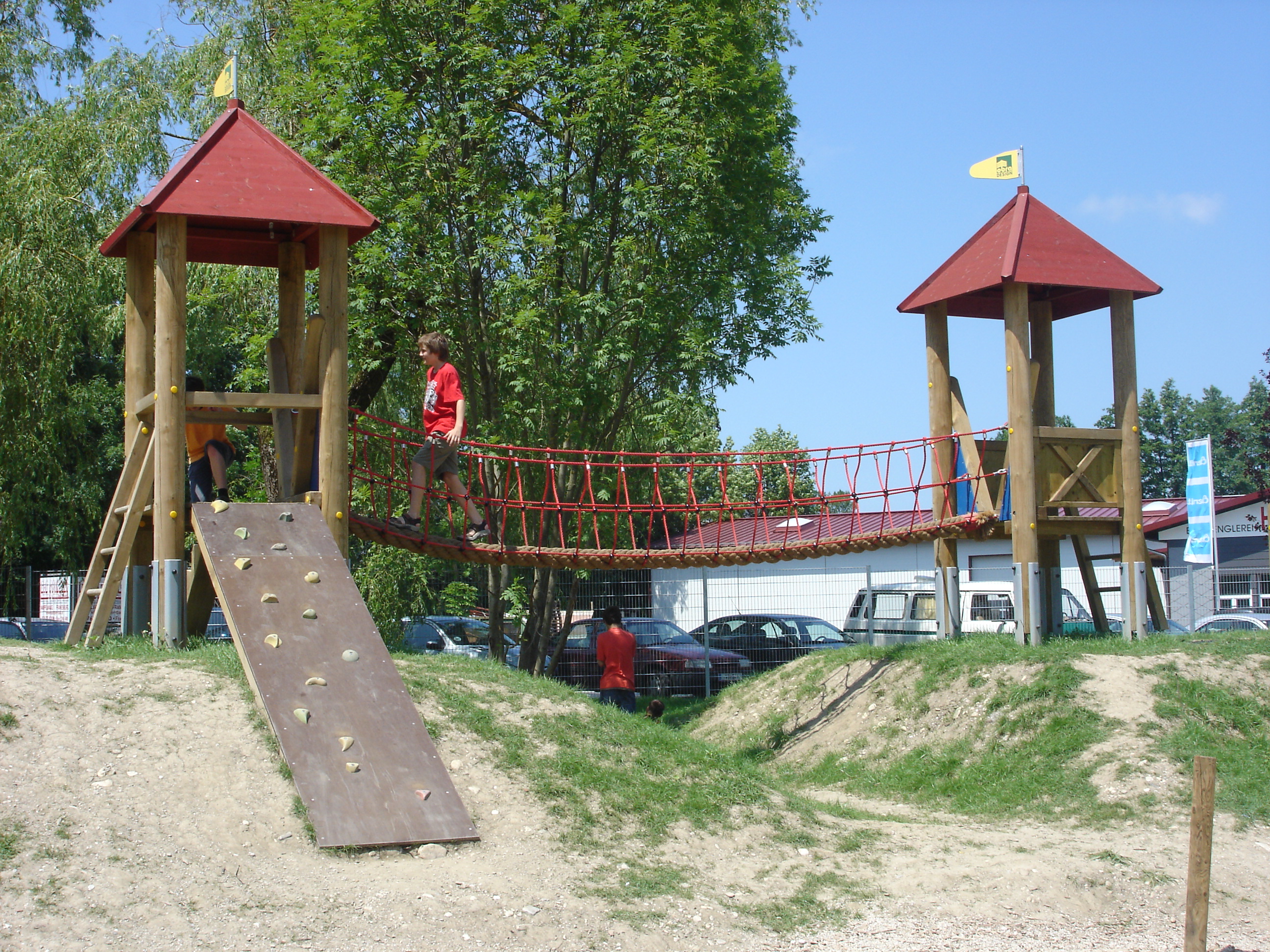 Beschreibung: 8 Steher (Pfosten) Ø 20 cm, mit Kern, 2 Podeste mit Unterzügen aus Kantholz 9/11 cm, Belag aus Kanthölzern 3,5/10 cm, genutet, 2 Verankerungsrahmen für Dschungelbrücke, 1 Dschungelbrücke aus Herkules-Tauwerk.