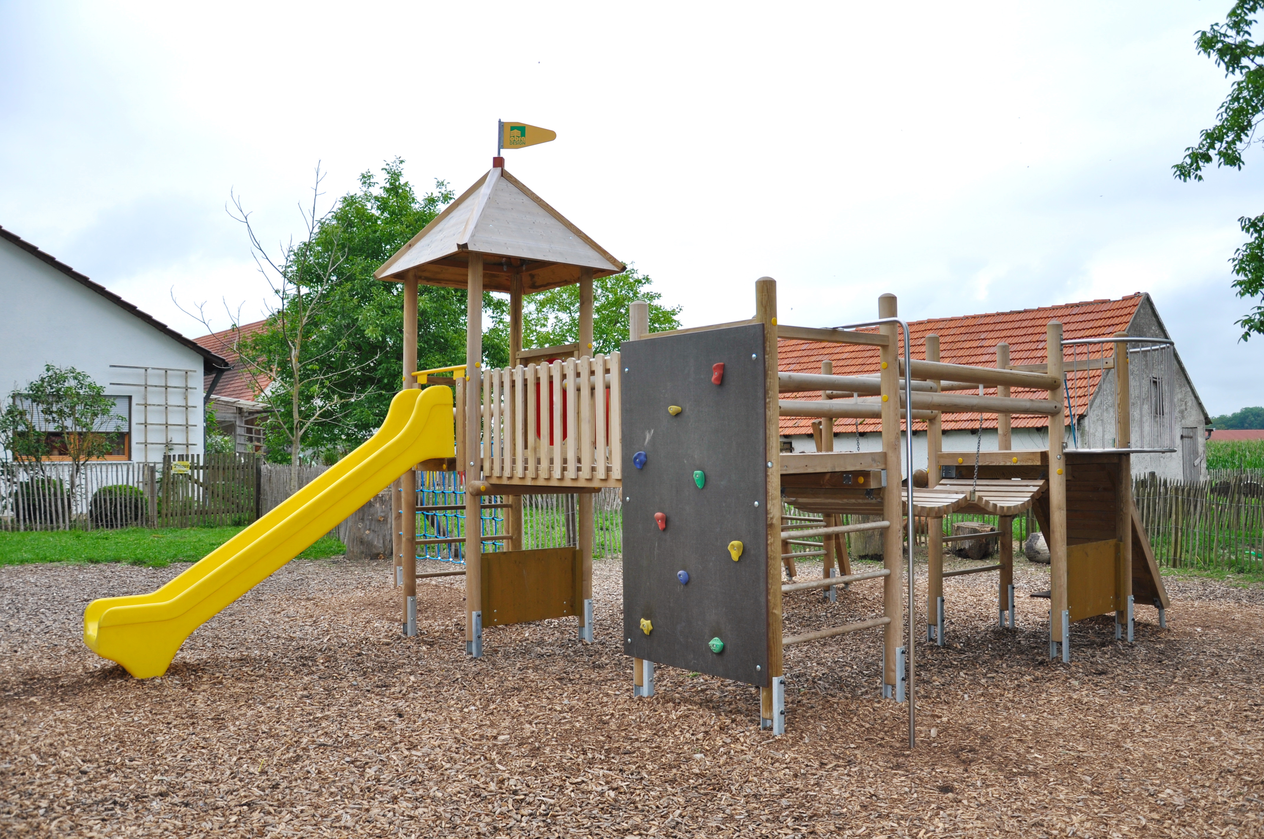 Beschreibung: 16 Steher, 4 Podeste, 6 Handläufe, 3 Brüstungselemente, 1 Zeltdach, 1 Wimpel drehbar, 1 Kriechtunnel 2 m lang aus GFK, 1 Fixbrücke, 1 Wackelbrücke, 1 Gummibahn-Brücke, 1 Balkon, Edelstahl, 1 Feuerwehr-Kletterstange, 1 Bergsteiger-Kletterwand senkrecht, 1 schiefe Ebene mit Hangeltau, 1 Leiter, 1 Netzeinstieg mit Rahmen, 1 Spielwand „Tante Emma Laden“, 2 Wände mit Sitzbank.