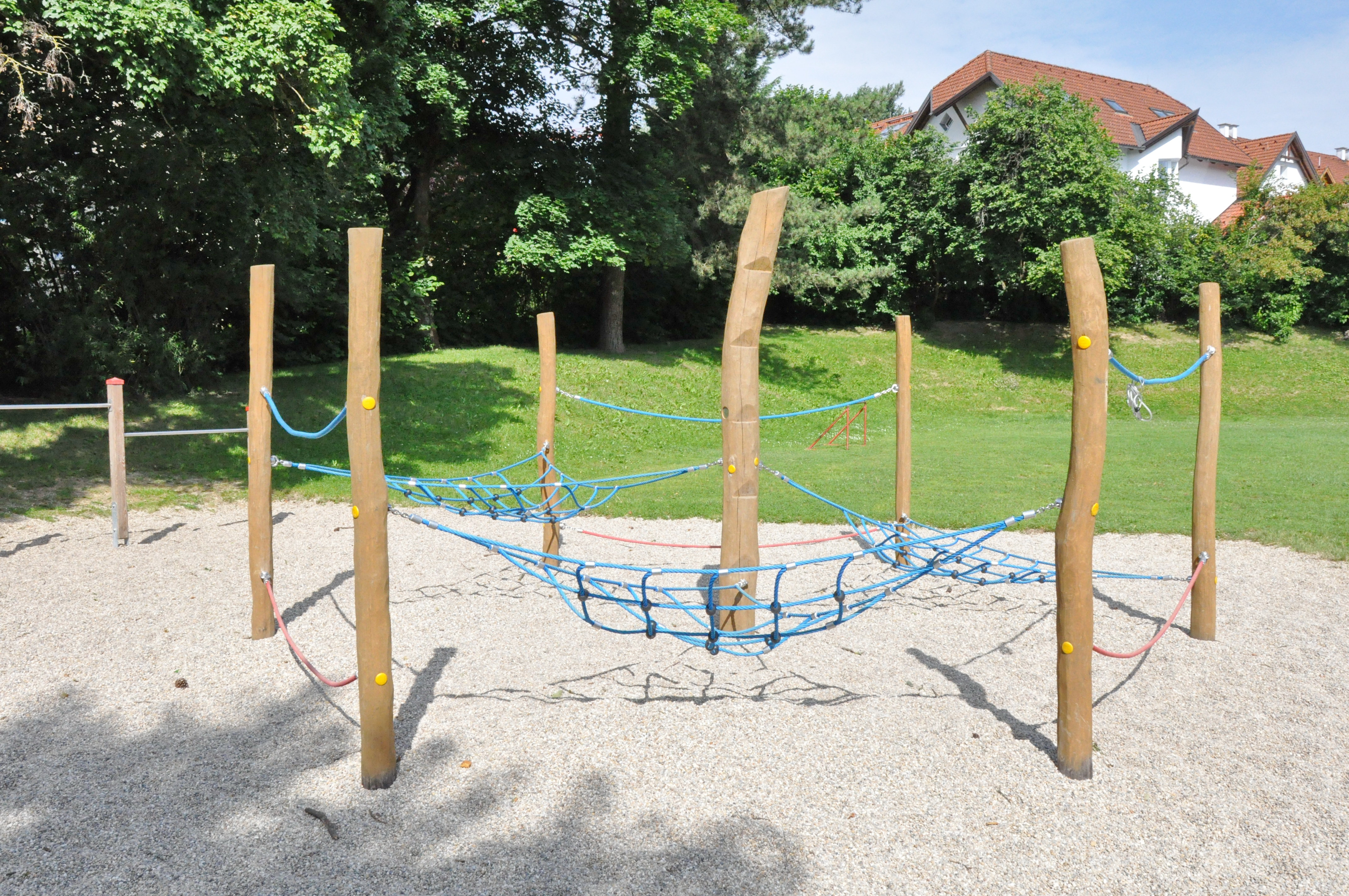 Die Kletternetz-Seil-Balancieranlage ist aufgrund der Flächennetze neben einem Klettergerät auch ein Treffpunkt zum Abhängen und Plaudern.