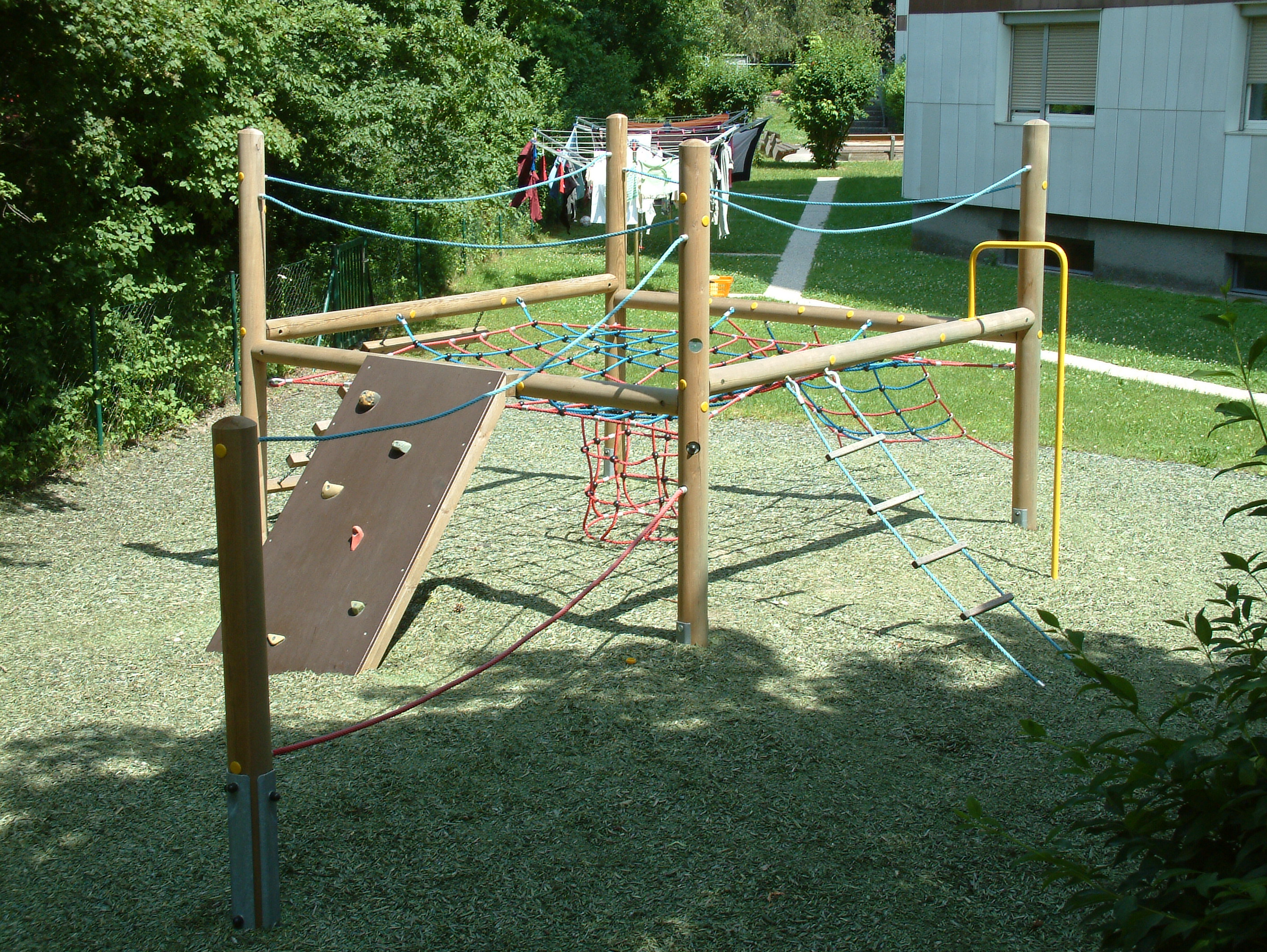 Beschreibung: 5 Steher (Pfosten), Rundhölzer Ø 14 cm, 4 Querhölzer Ø 12 cm, 1 Quadrat-Kletternetz mit Netztrichter, 1 Feuerwehr-Kletterstange, 1 Strickleiter, 1 Netzeinstieg ohne Rahmen, 1 Bergsteiger-Kletterwand, 1 Balken-Kettenaufstieg, 1 Balanciertau mit Haltetau, 3 Handlaufseile, 1 Handlauf in Niro.